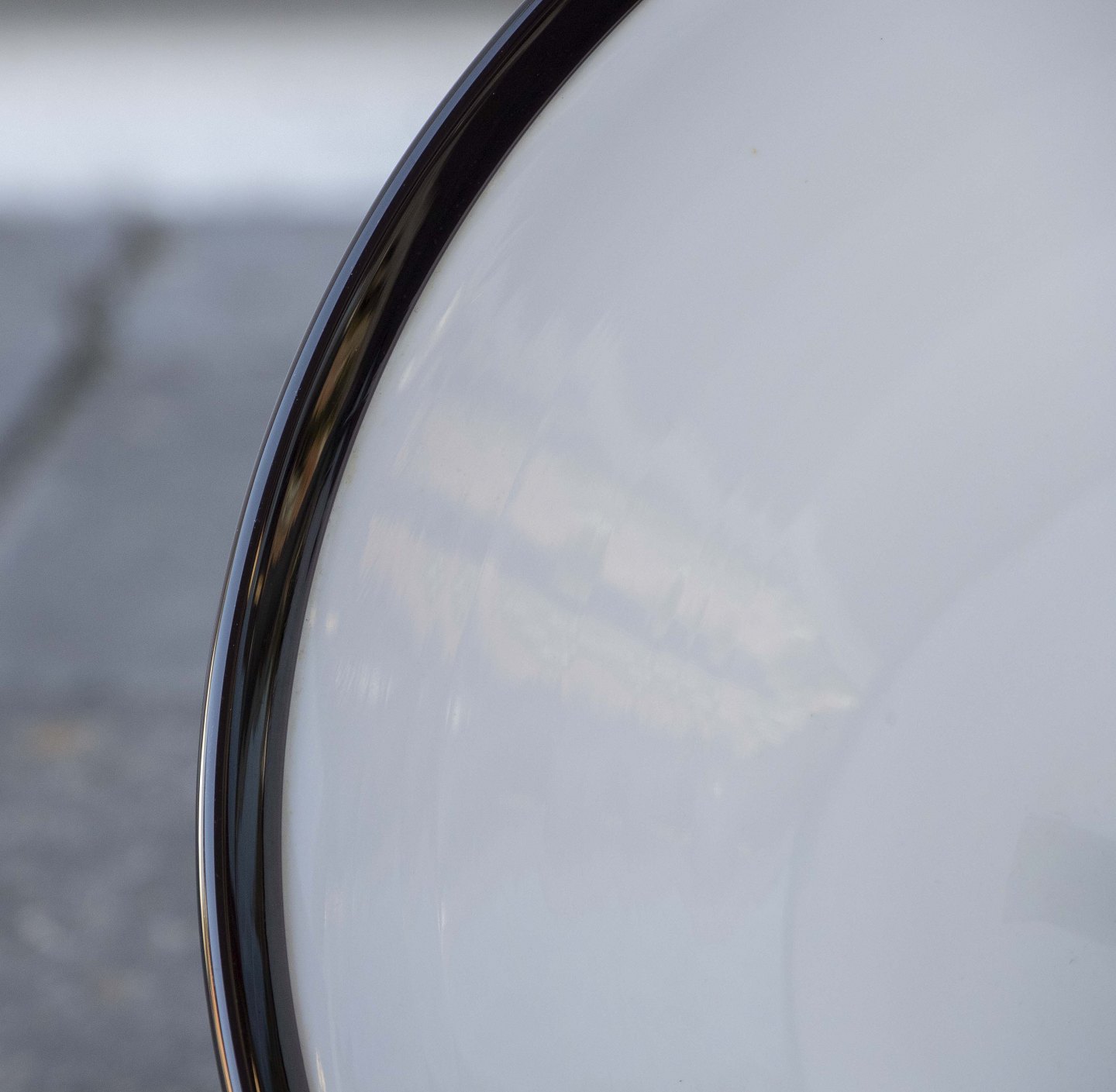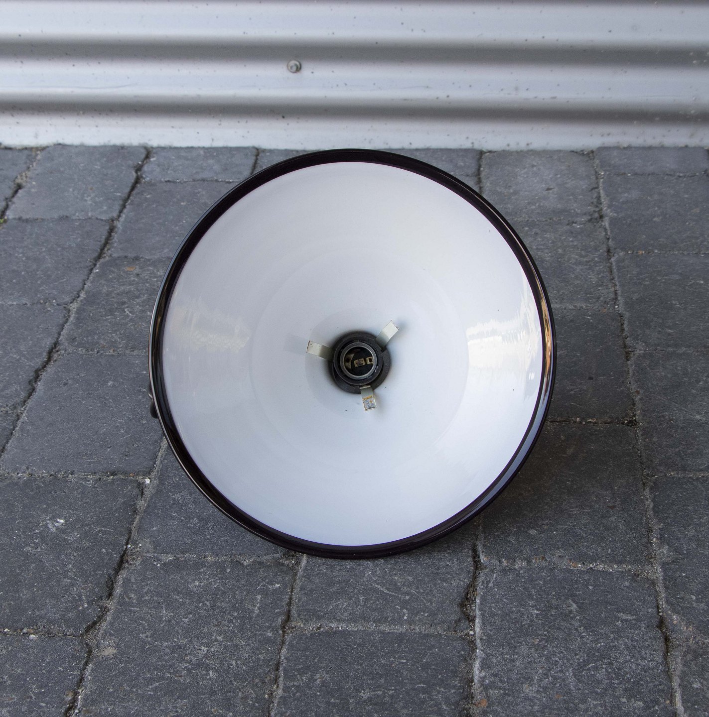 Loftslampe med skærm i aubergine/sort glas med opalhvid inderside, med lys igennem fremtræder den rødlig.