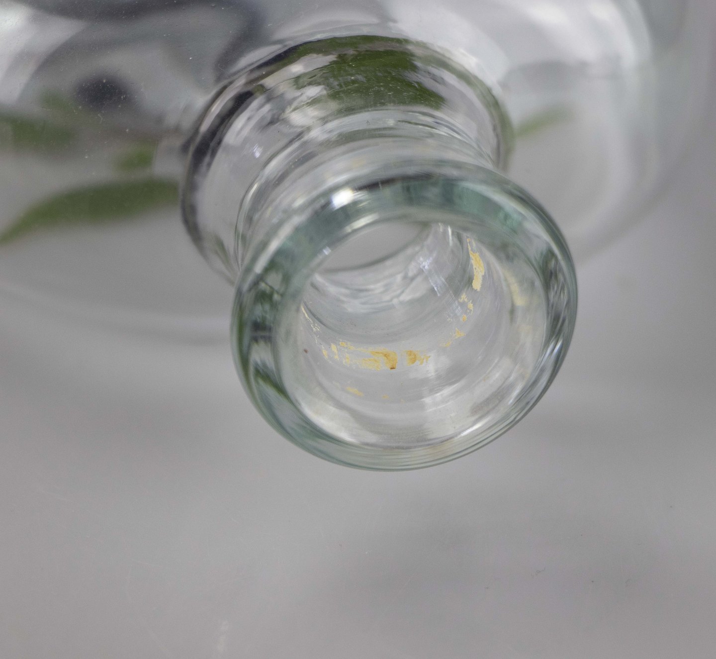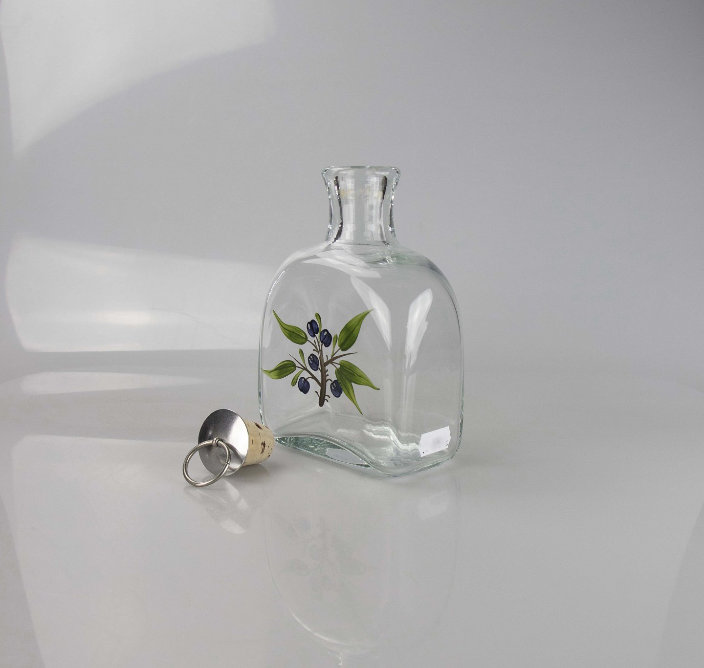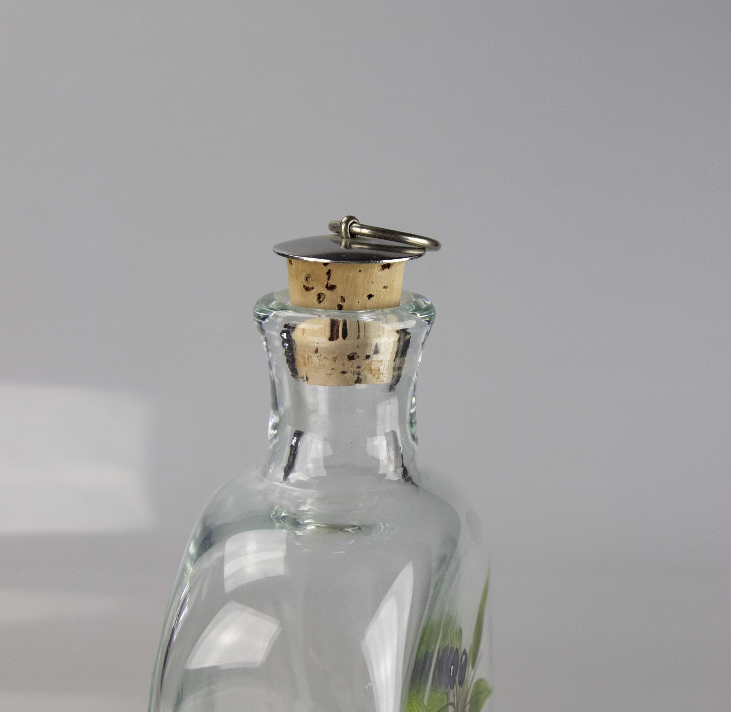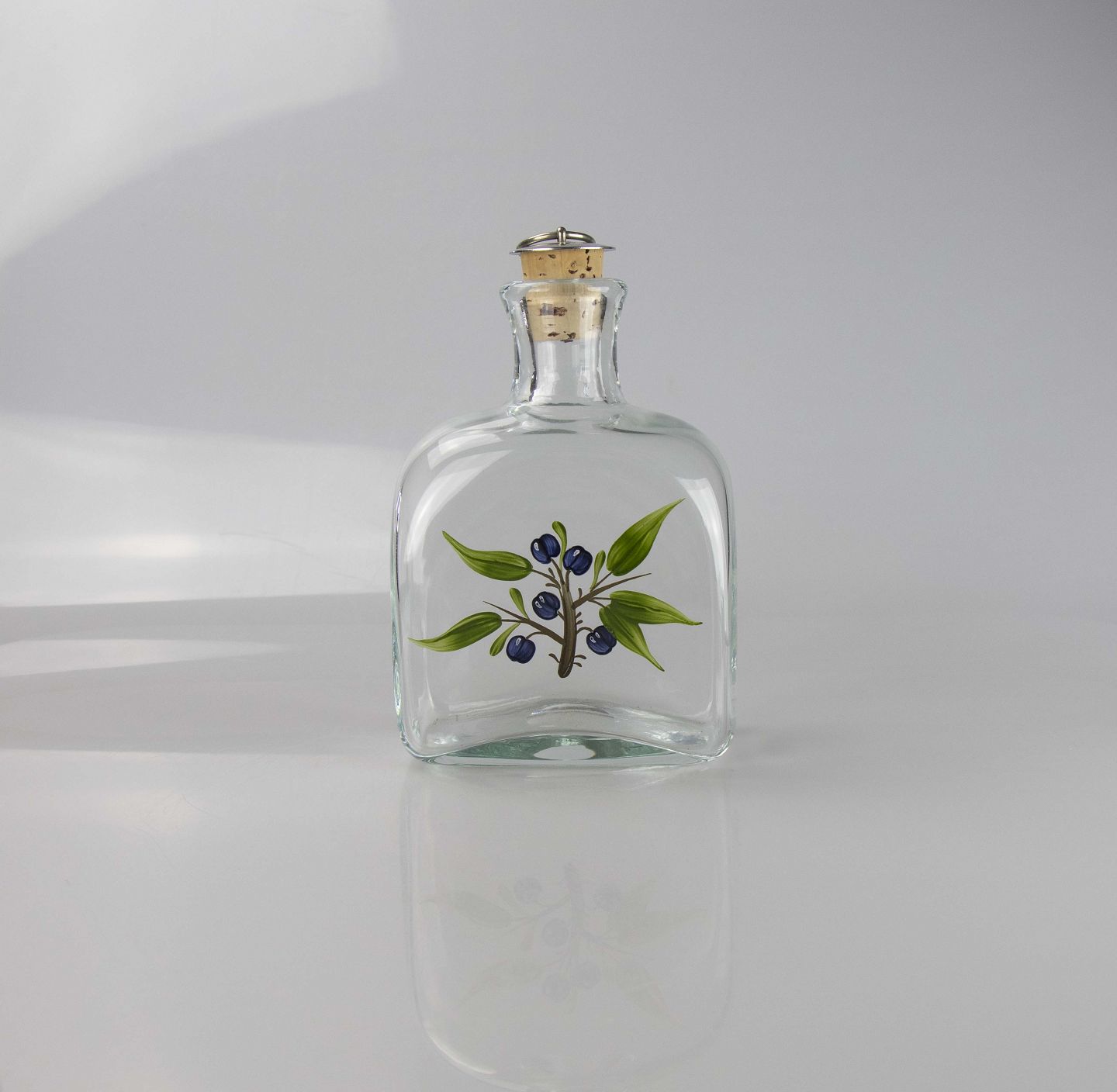 Flaske med malet motiv af blommegren og korkprop med tin.