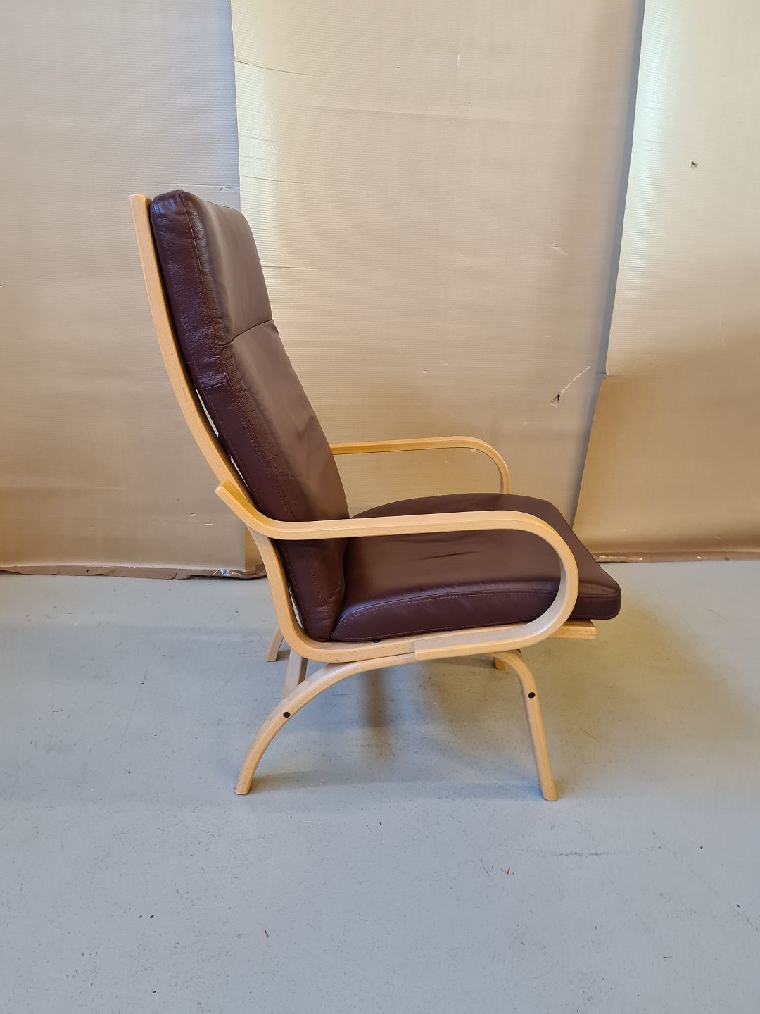 Lænestol i bøgetræ med læderhynde fra 2000erne.