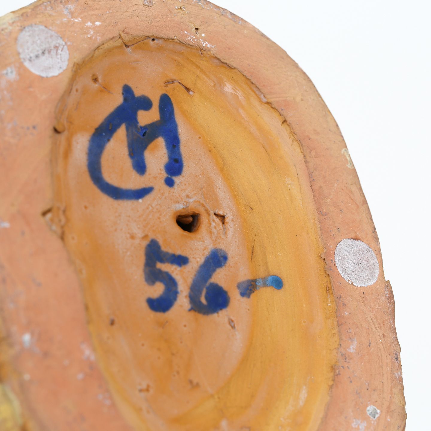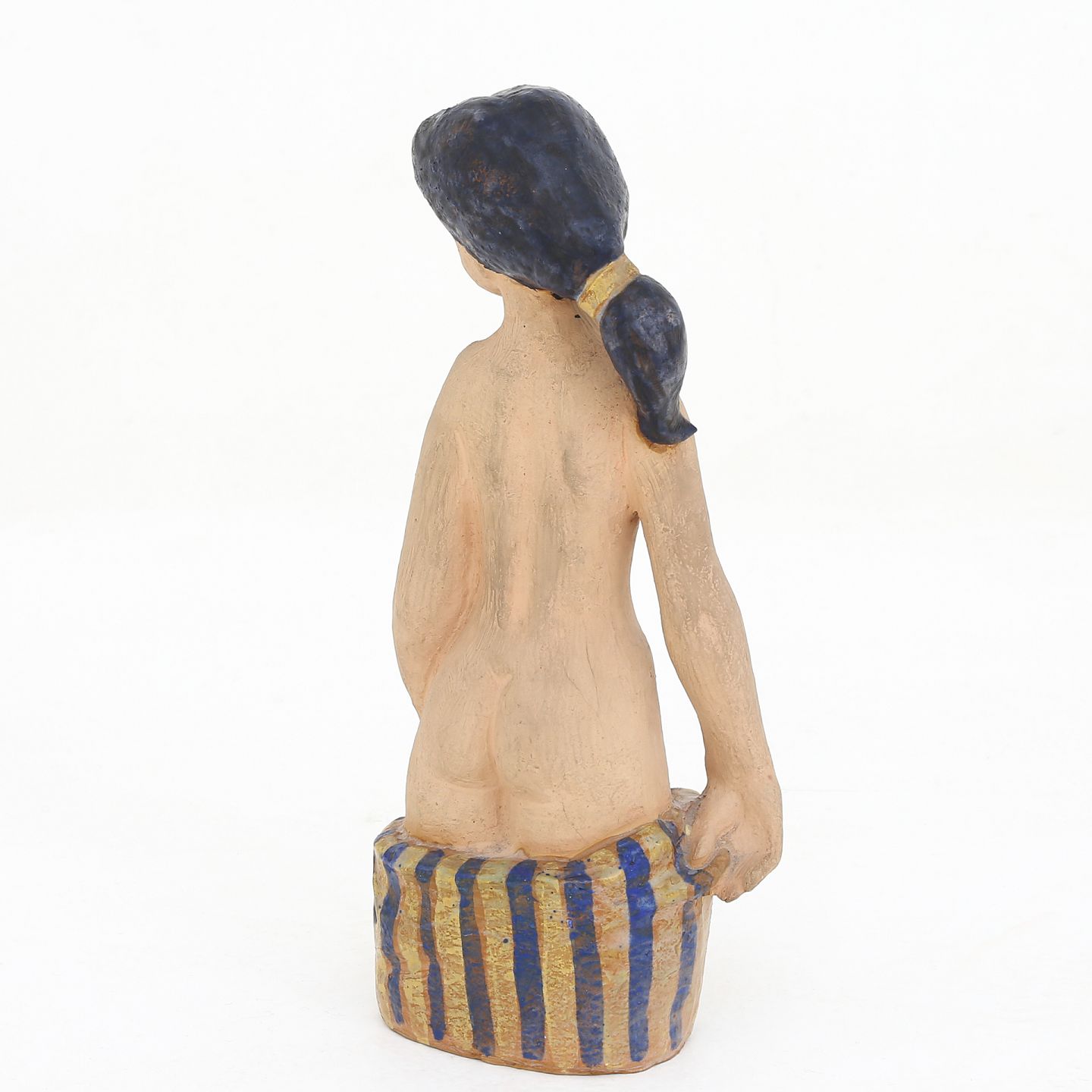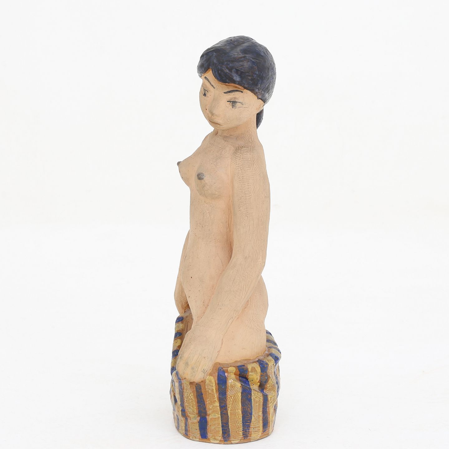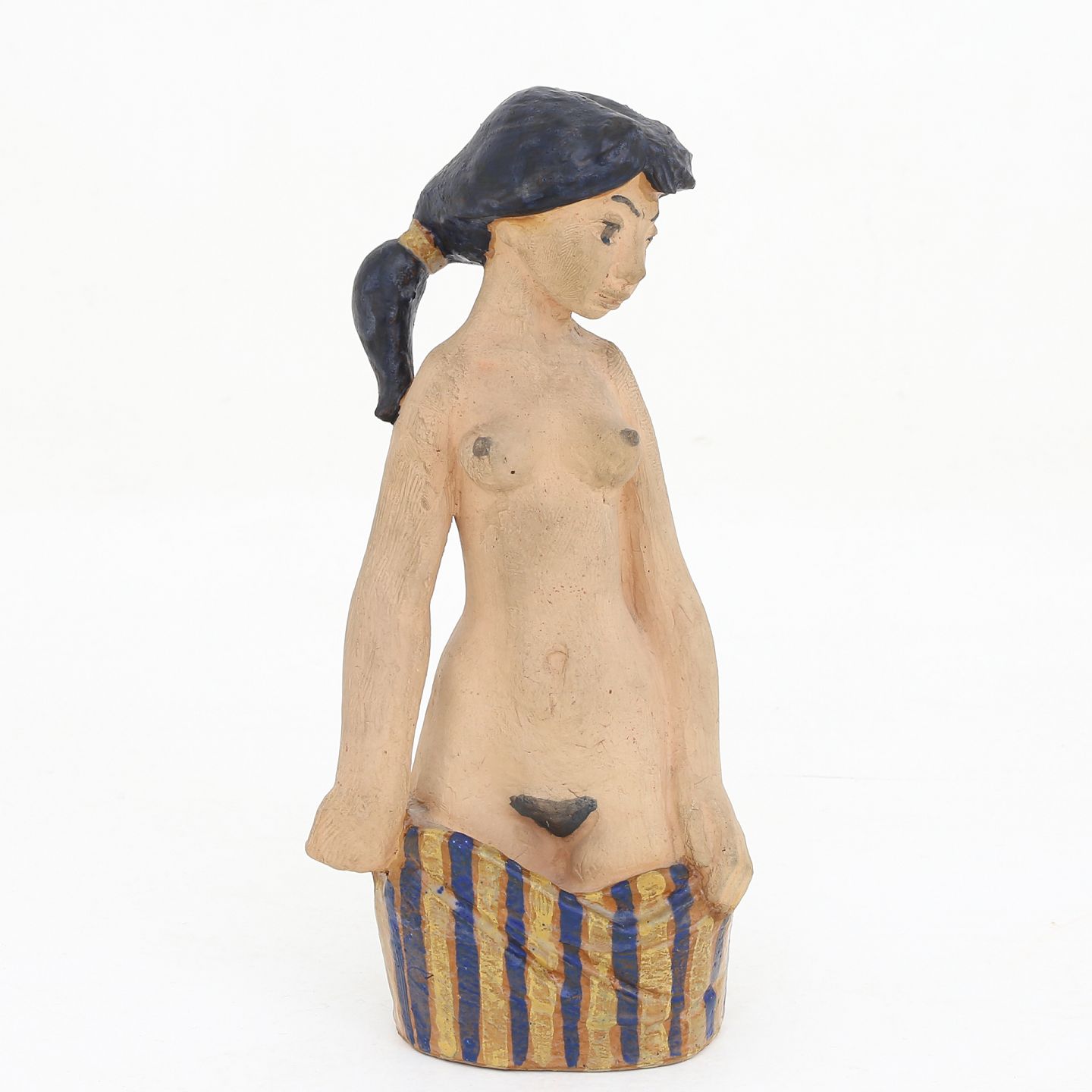 Figur i delvist glaseret lertøj med form af kvinde. Signeret.