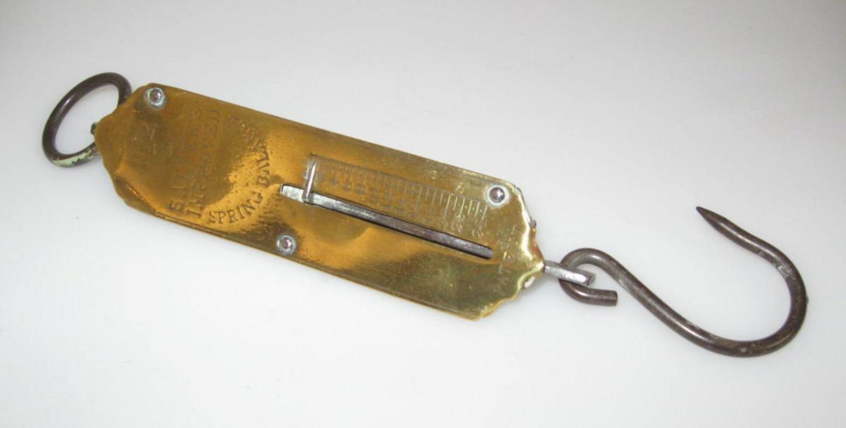 Vægt i messign og jern, ca.1900, England. No. 2. Salter's improved spring balance. Patent. Længde med krog: 24 cm.