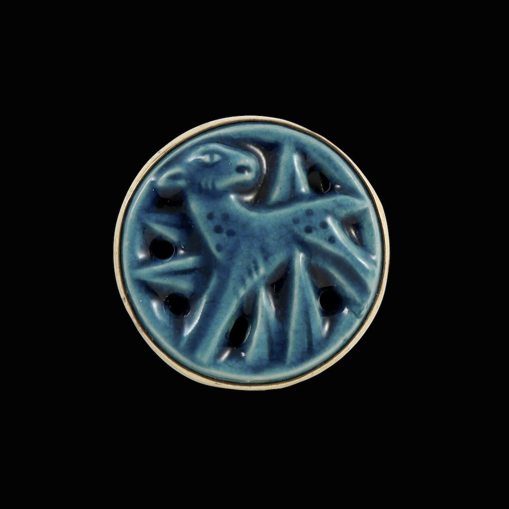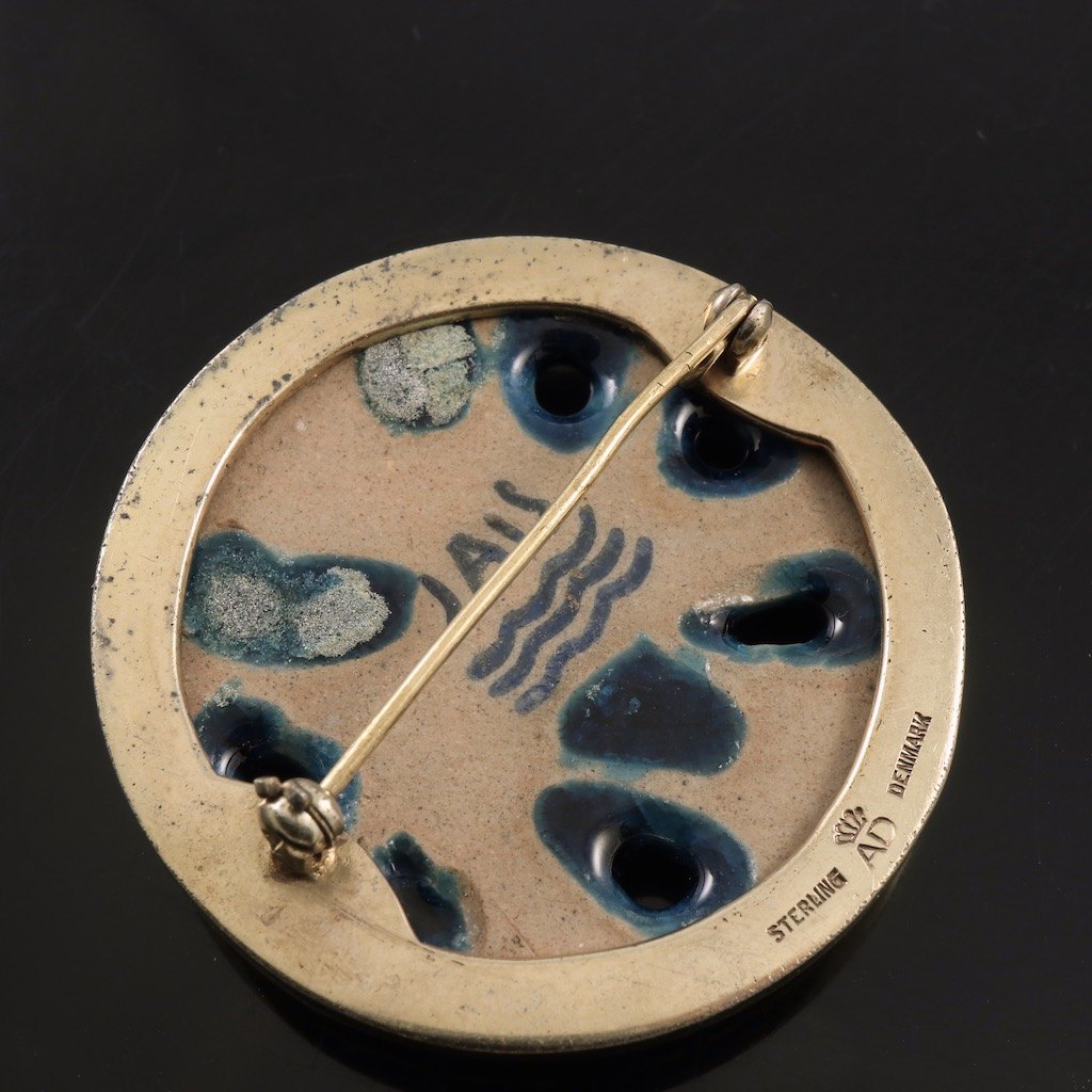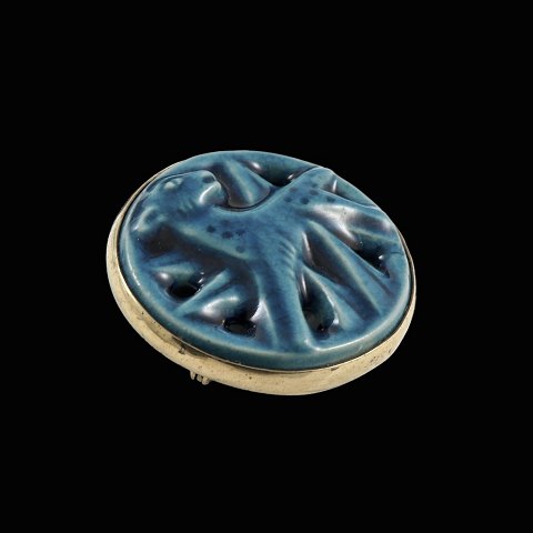 Jais Nielsen 1885-1961. Broche i keramik med blå glasur med montering i forgyldt sterling sølv.