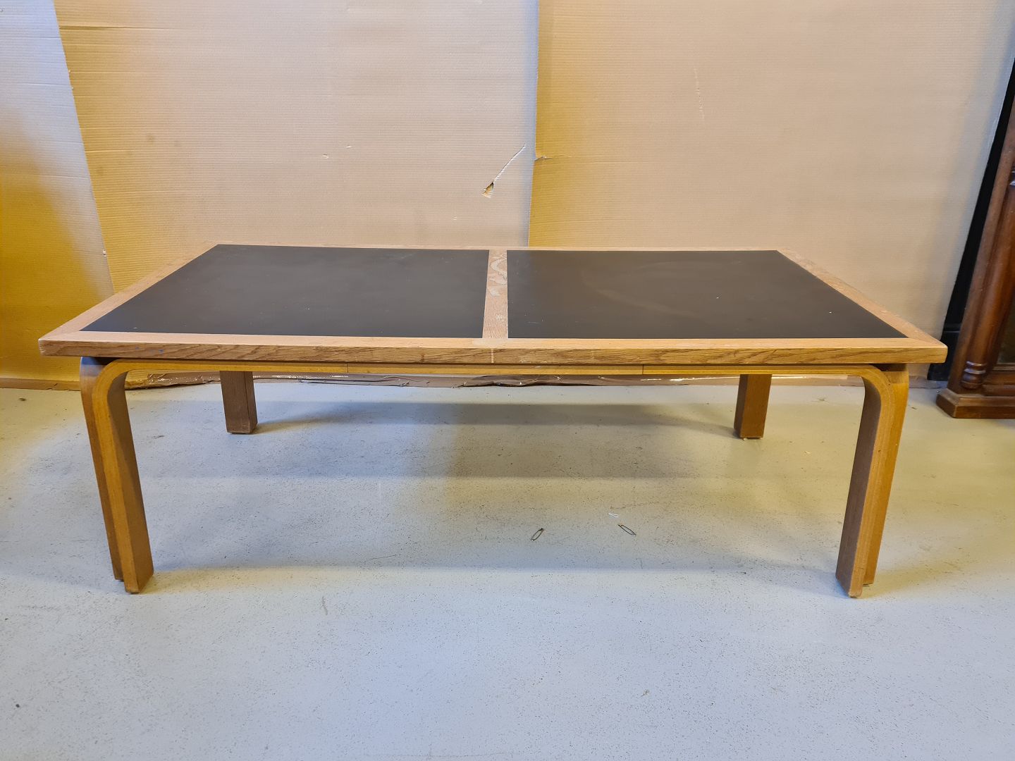 Sofabord i fineret egetræ med sort laminat fra 1970erne.