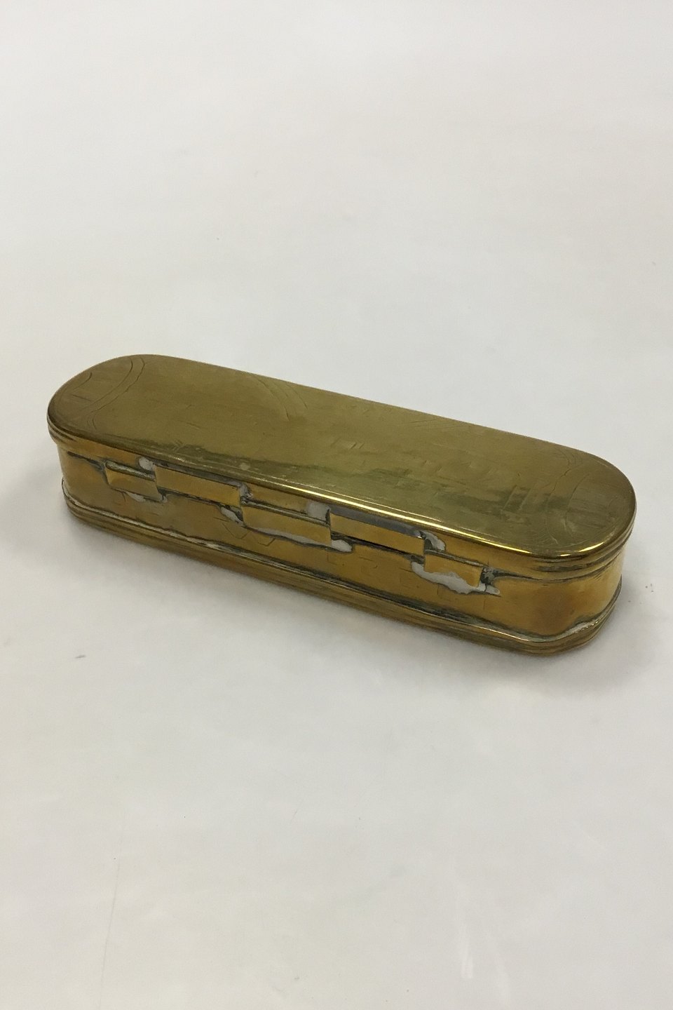 Snustobaksdåse af messing med dekoration og tekst(slidt). Måler 15 cm(5 29/32 in.)
