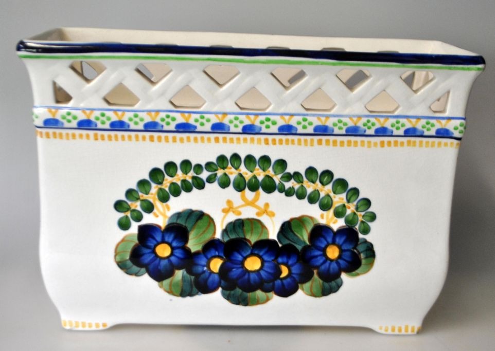 Aluminia jardiniere uden gitter, 838/608, København, Danmark. Fajance. Dekorerert med blåt, gult, grønt og rødt. Stemplet. H.: 19 cm. L.: 28 cm. B.: 10,5 cm.