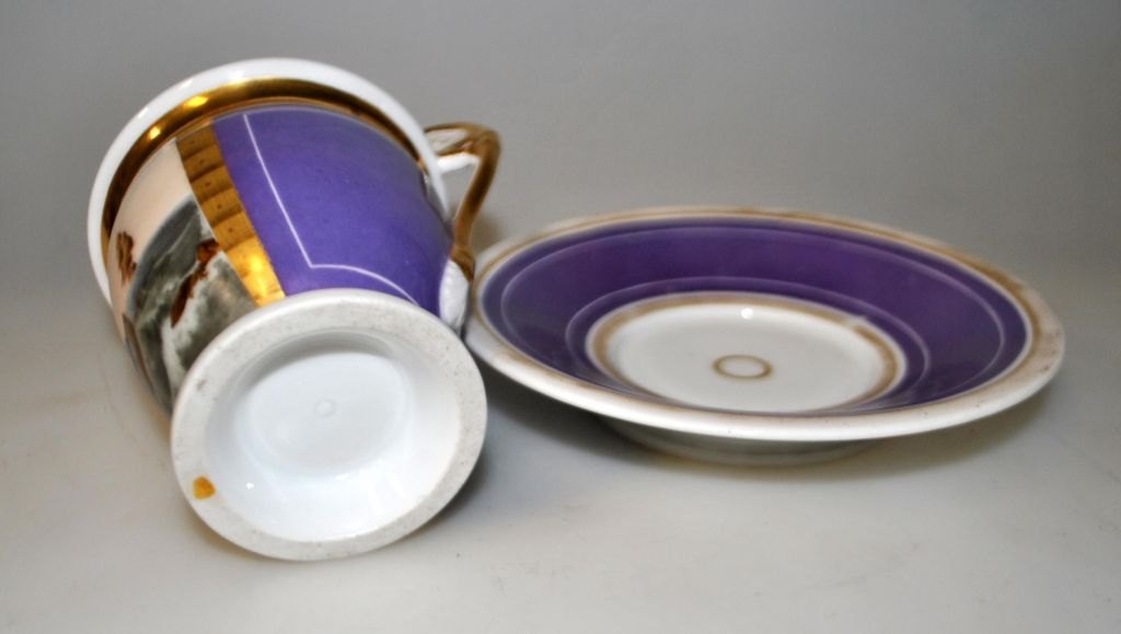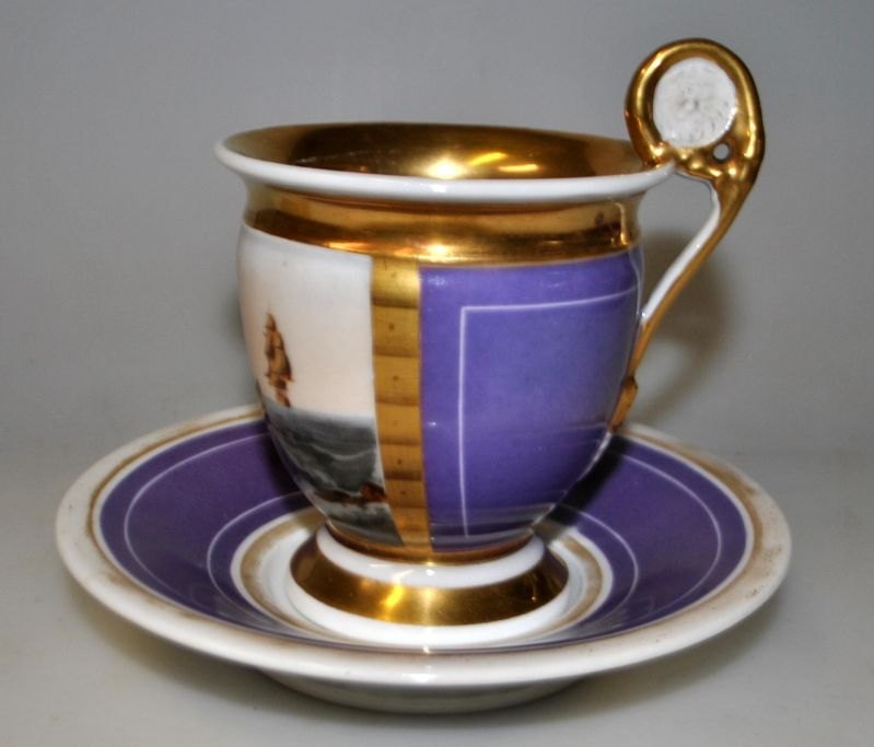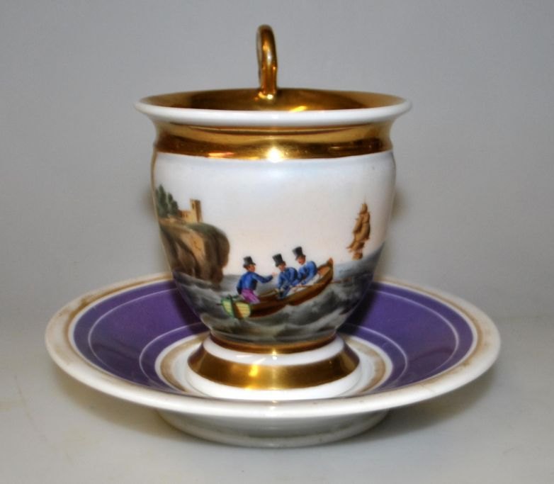 Fransk empire kaffekop med underkop i porcelæn, ca. 1800. Håndmalet motiv med robåd med tre personer, der sejler mod et stort sejlskib. Med violet glasur og forgyldninger. Hank dekoreret med løve. Kop højde.: 10,5 cm. Dia. underkop: 13,5 cm. Ustemplet.