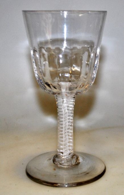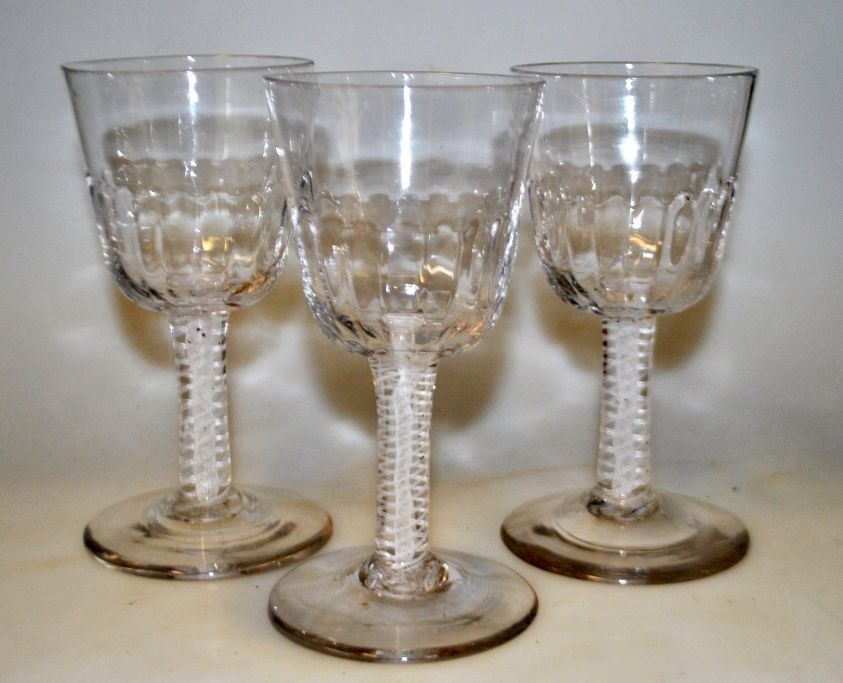 Engelske drikkeglas, 18./19. årh. Formstøbt kumme og påsat stilk med indvendige fine tætsnoede dybe luftspiraler. Højde: 14,5 cm. NB: Absolut perfekt stand - sælges kun samlet.