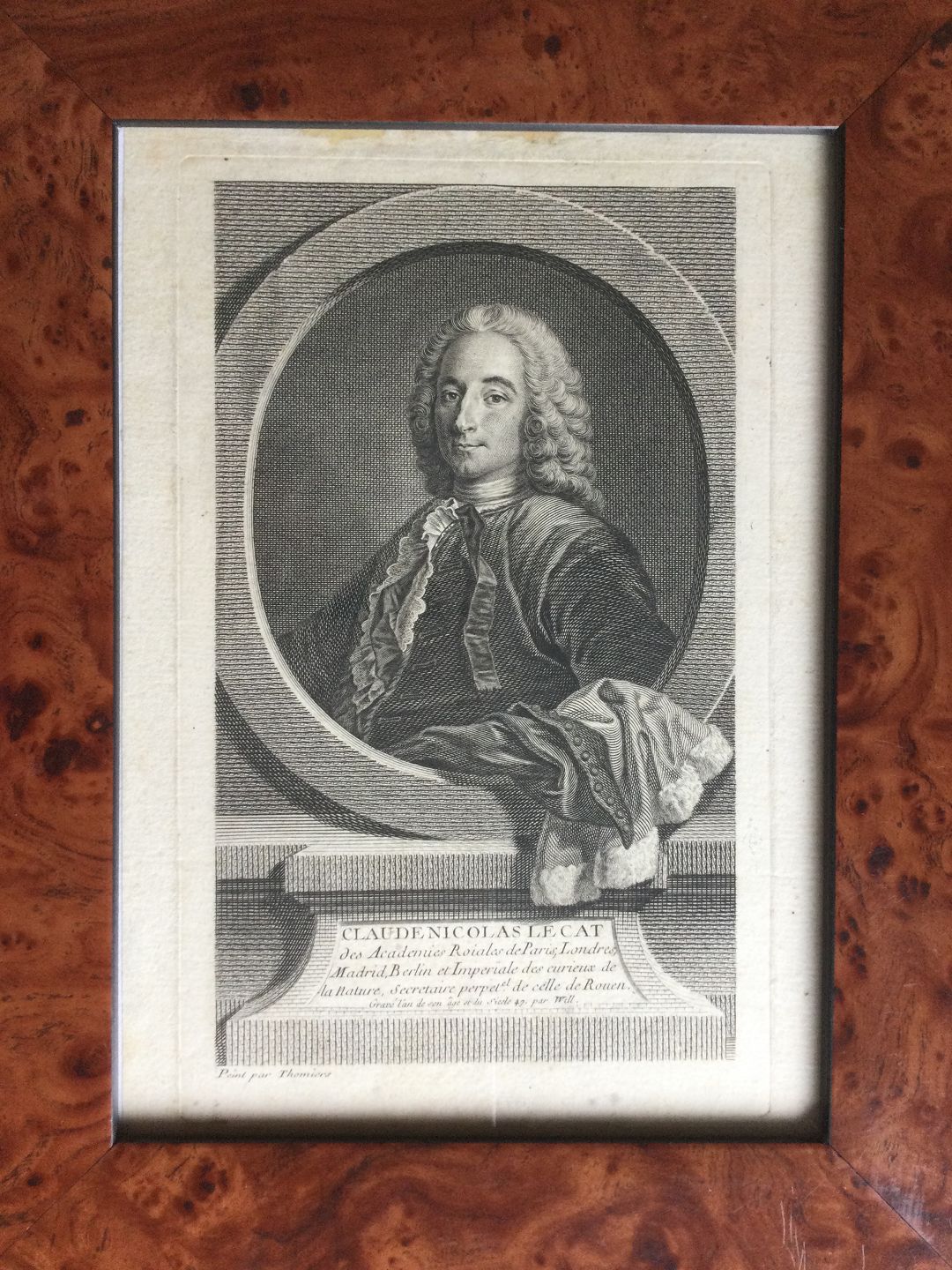 Text available in Danish: Kobberstik af Jean Georges Wille - Portræt af Kirurg Claude Nicolas Le Cat 1747.