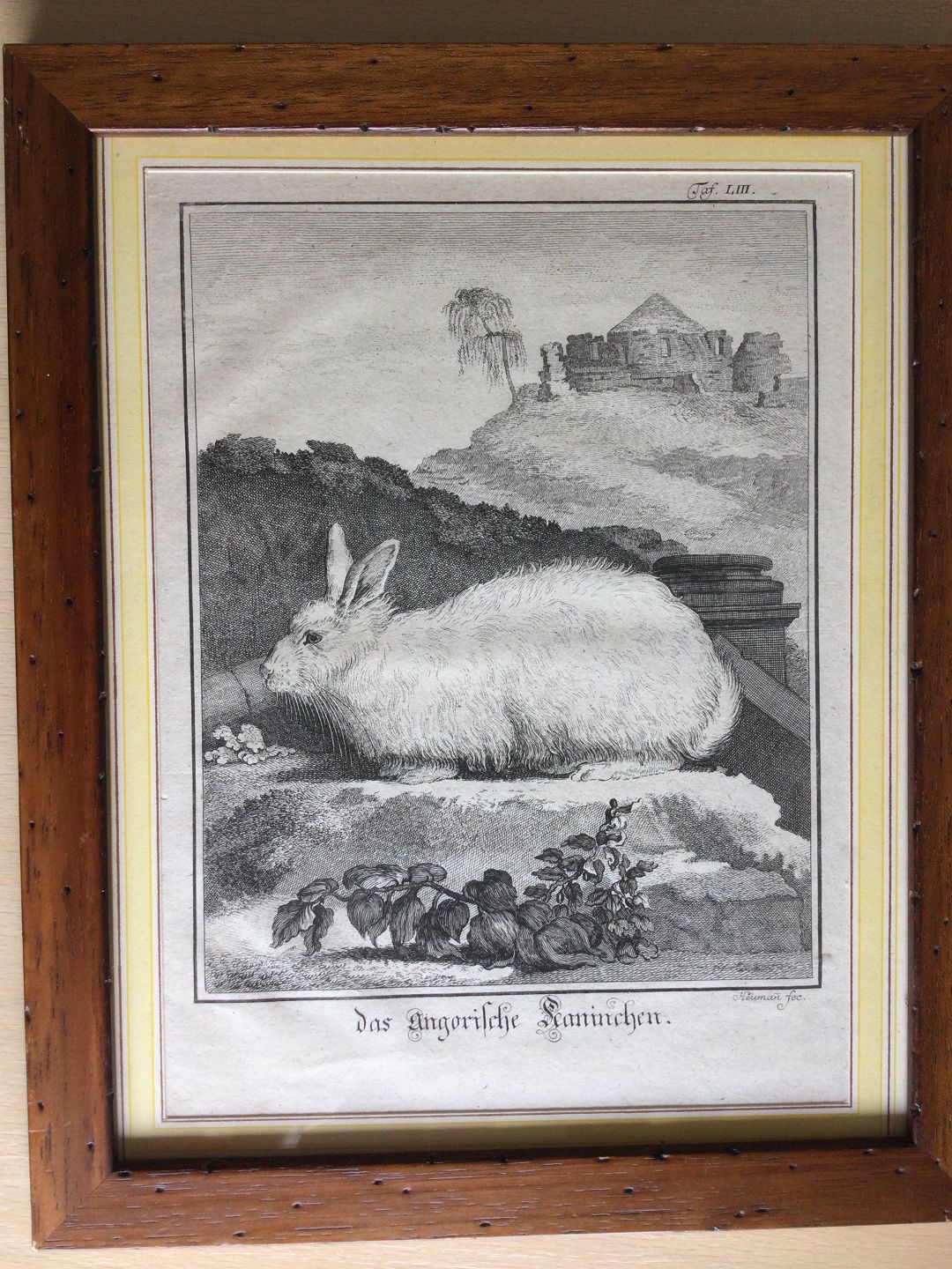 Text available in Danish: Kobberstik af Georg Daniel Heumann ca. 1760 - Angora kanin i landskab.