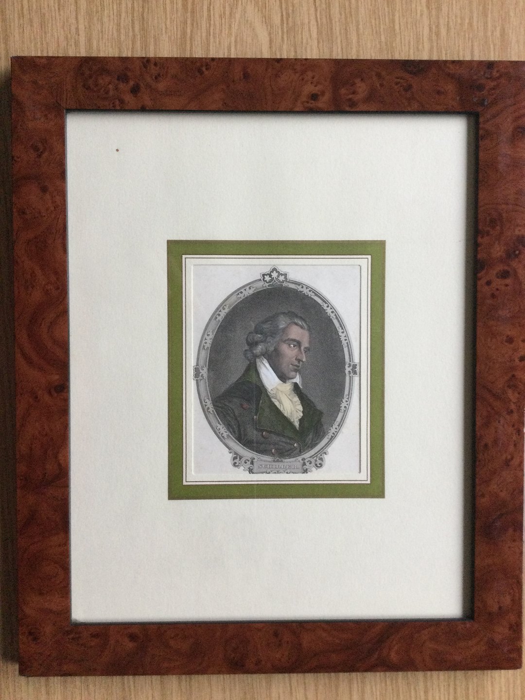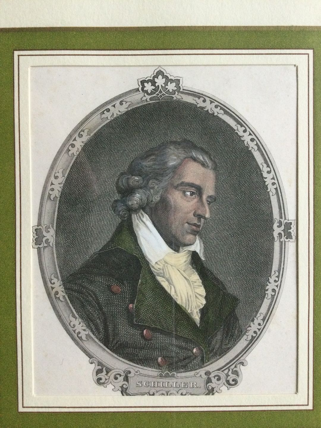 Text available in Danish: Koloreret stålstik af Johann Kracker - Portræt af Freidrich Schiller.