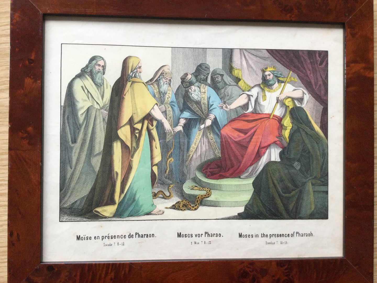 Koloreret litografi af Aaron B. Hummel - Moses' stav bliver til en slange - "Moses vor Pharao".