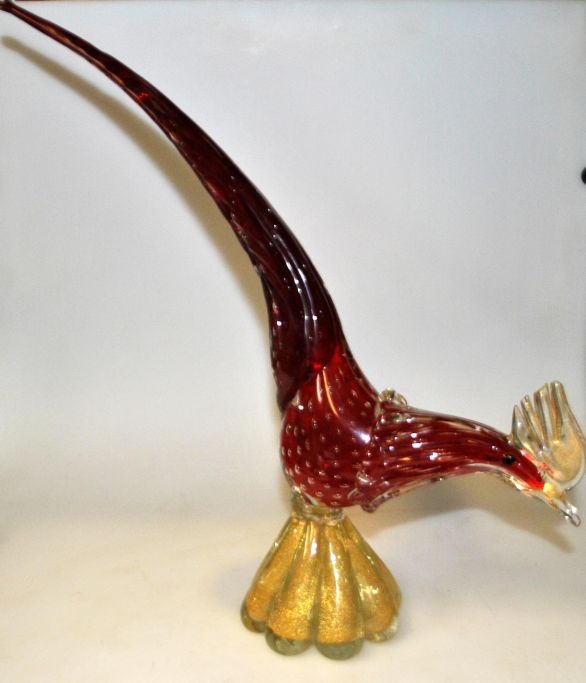 Fasan, Murano, 1950'erne, Italien. Klart glas. Indvendig rødt glas. Med luftbobler. Fod og næb med guldstøv. Højde.: 35,5 cm. L: 37 cm. Perfekt stand! Udført af Archimede Seguso.