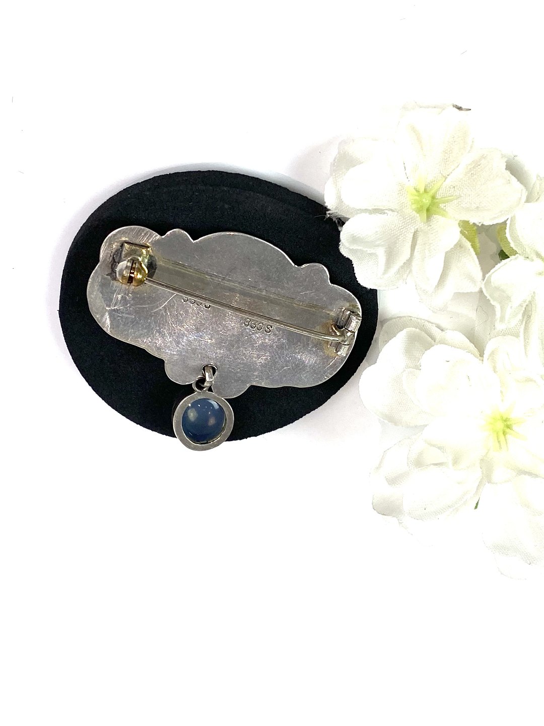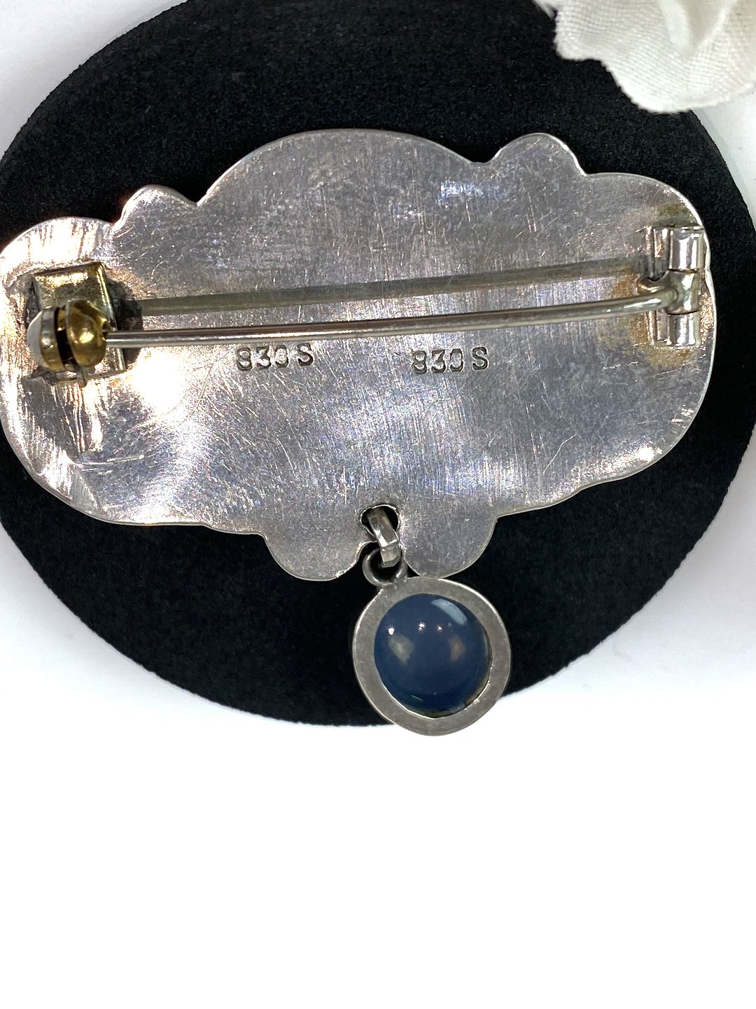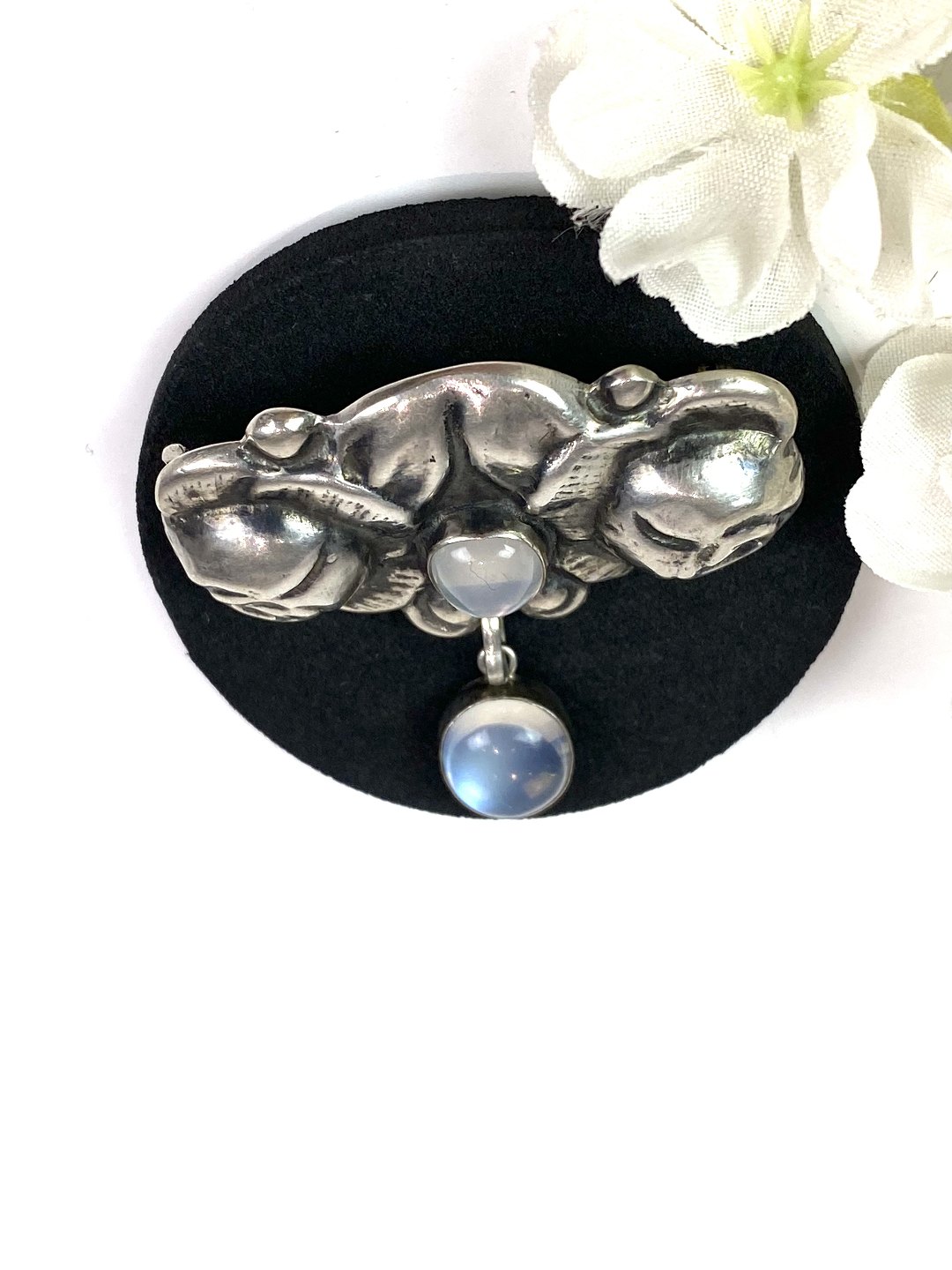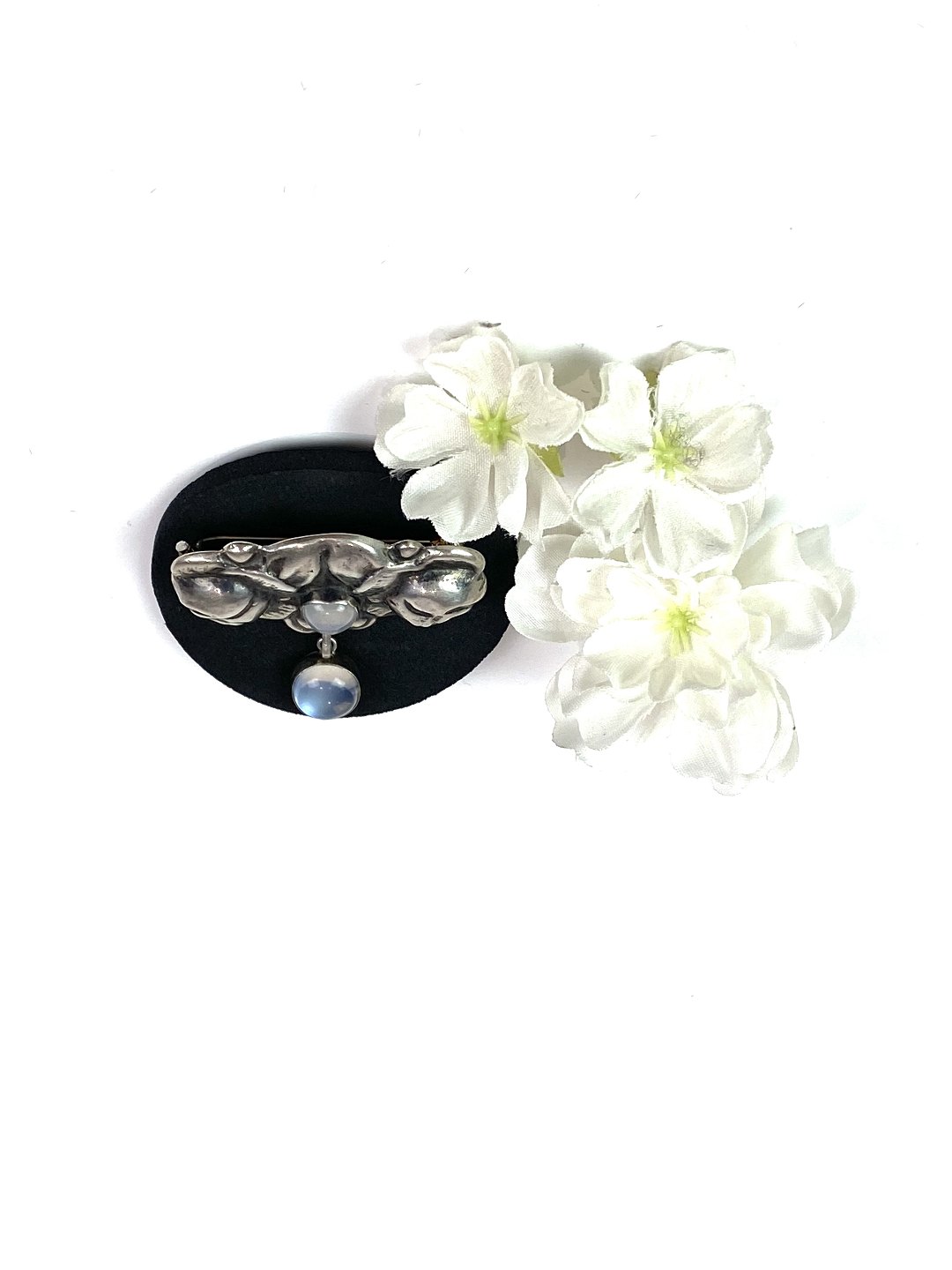 Broche af 830 sølv dekoreret med månesten.
