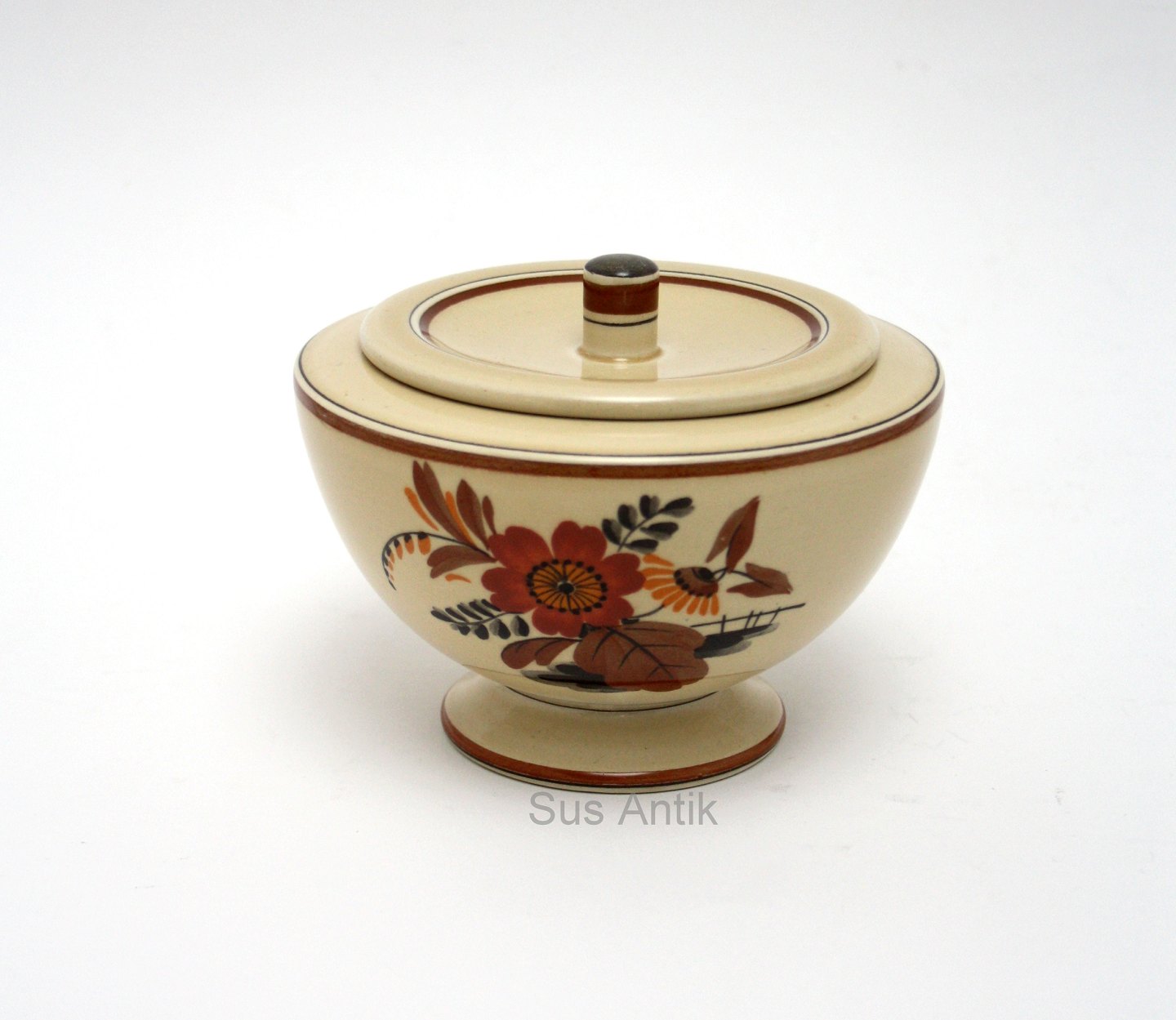 Marmeladeskål med låg. Fin stand med lettere overfladekrakelering. Højde 10 cm. Diameter 13 cm. Pris: 375 kr. stk. Lager: 2