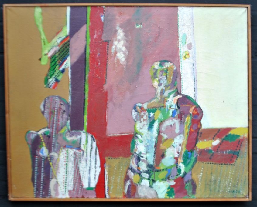 Nielsen, Hans Helge (1942- ) Danmark: To figurer. Olie på lærred. Signeret 1974. 80 x 101 cm. Verso betegnet.