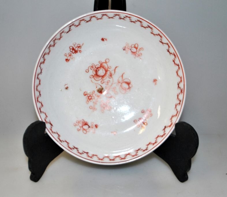 Kinesisk kop med underkop, 19. årh. Håndmalede dekorationer med geometriske mønstre og røde blomster. H.: 5,5 cm. Dia. underkop: 13,8 cm.