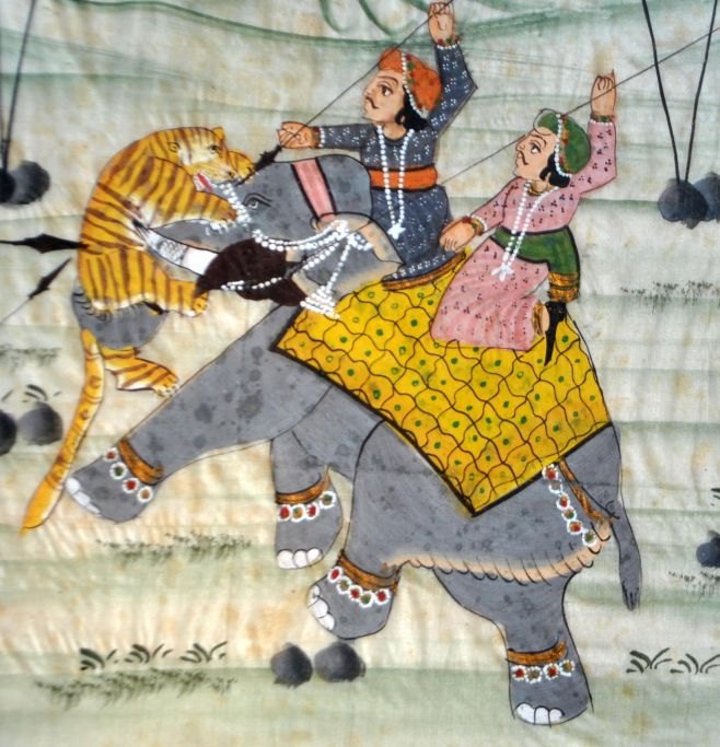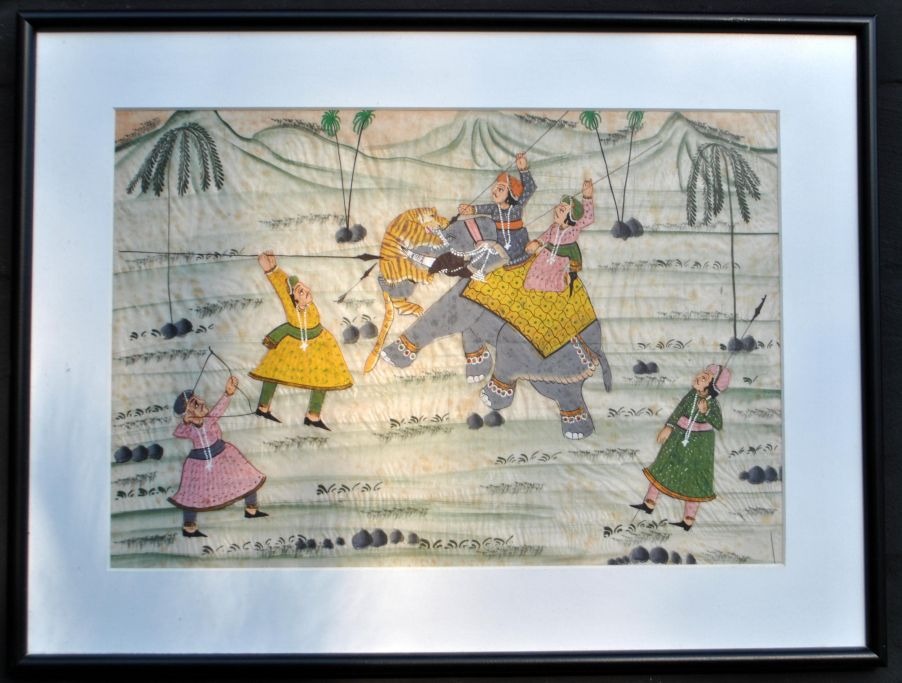 Pakistansk kunstner (20. årh.) Tigerjagt med elefant. Olie på silke. 31,5 x 46 cm.