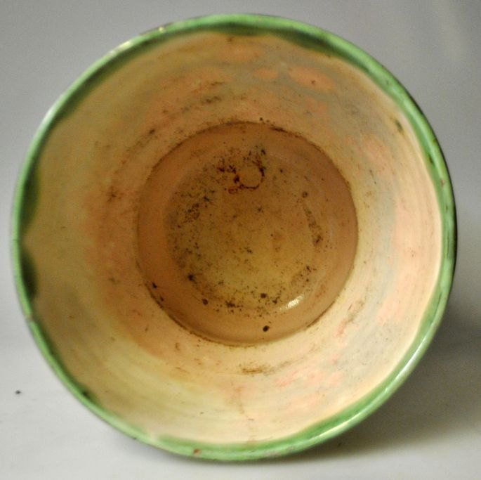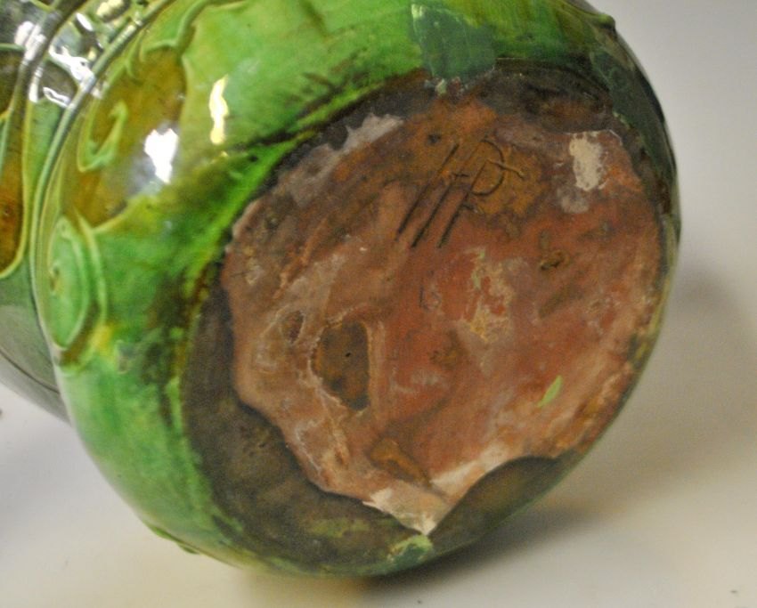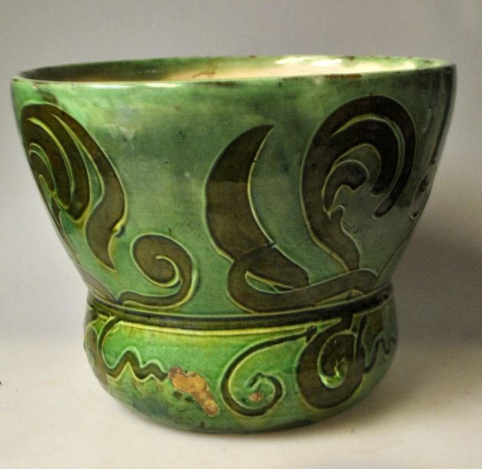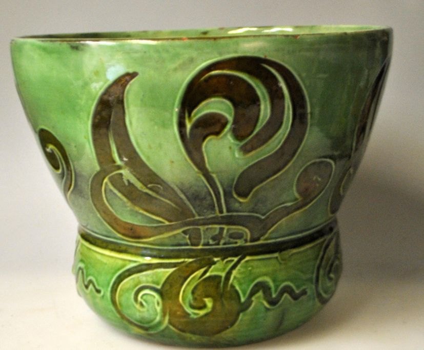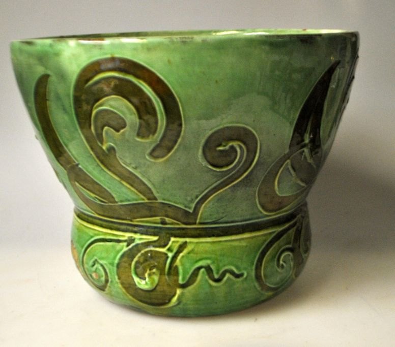 Dansk jugend urtepotte, ca. 1900. Grønglaseret med blomsterornamentik Stemplet. Højde: 16 cm. Dia.: 21 cm.