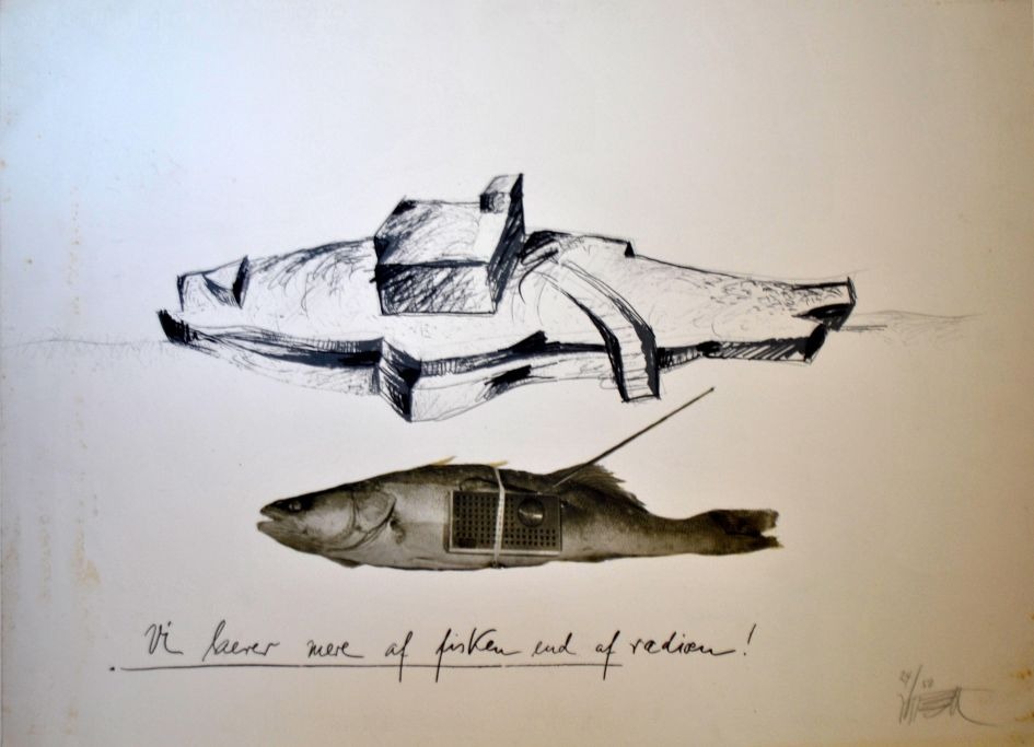 Vostell, Wolf (1932 - 1998) Tyskland: Vi lærer mere af fisken end af radioen. Litografi. Signeret 24/50.