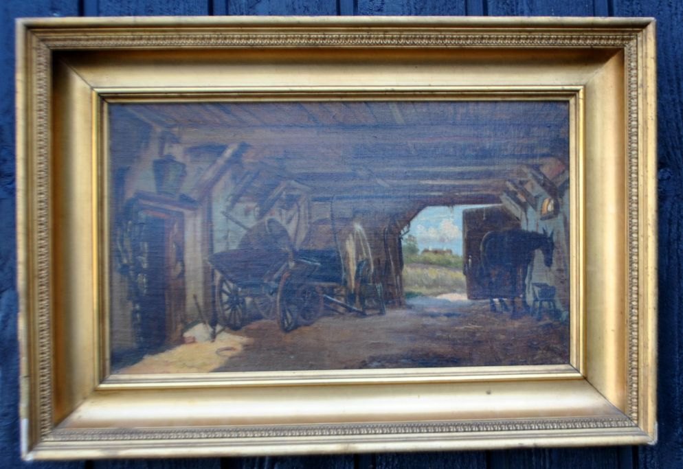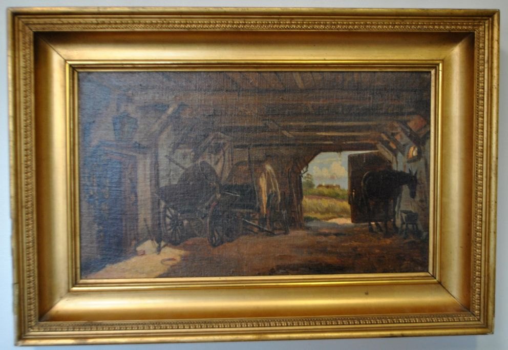 Fischer, August (1854 - 1921) Denmark: From a carriage gate with horse and carriages. Oil on canvas. Signed. 22.5 x 37 cm.