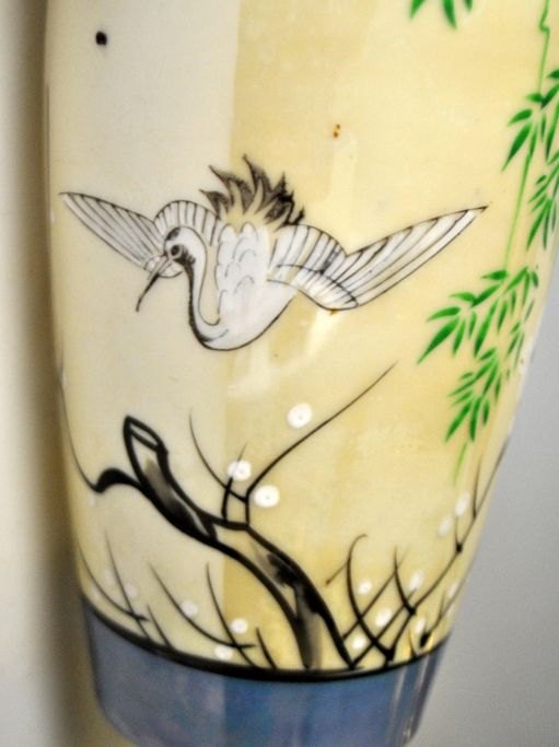 Japansk porcelænsvase, ca. 1920. Med håndmalede dekoration i form af flyvende trane. Med perlemors glasur. Ustemplet. H.: 18,5 cm.