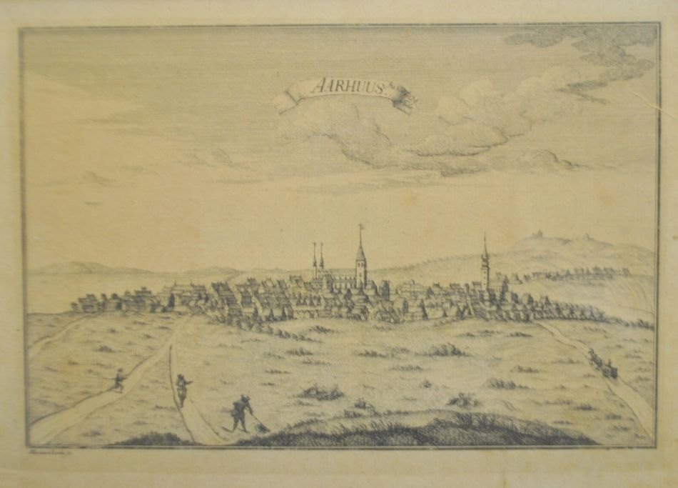 Prospect over Aarhus. The Danish Atlas. 1763 - 1783. Published by Eric Pontoppidan, vol. 4. Aarhus seen from the north. Stitched by Alexia v. Lode. 17.5 x 25.5 cm.