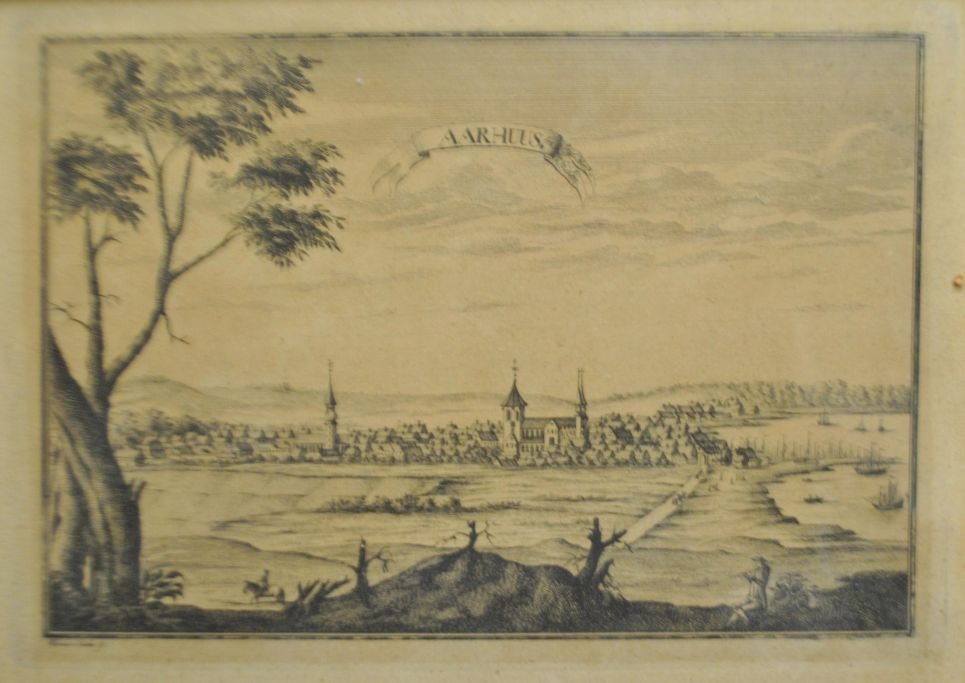 Prospect over Aarhus. Den Danske Atlas. 1763 - 1783. Udgivet ved Eric Pontoppidan, bd. 4. Aarhus set fra syd. Stukket ved Alexia v. Lode. 17,5 x 25,5 cm.