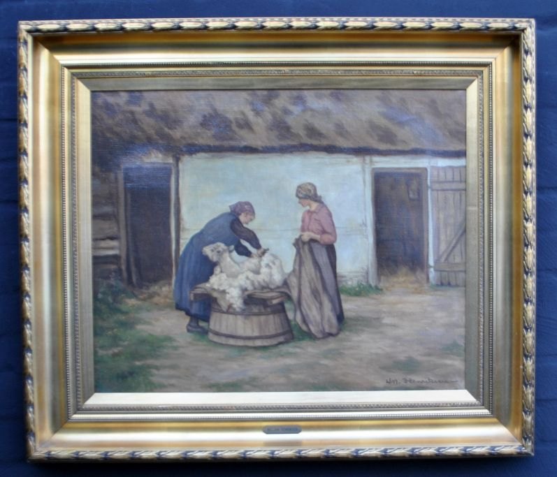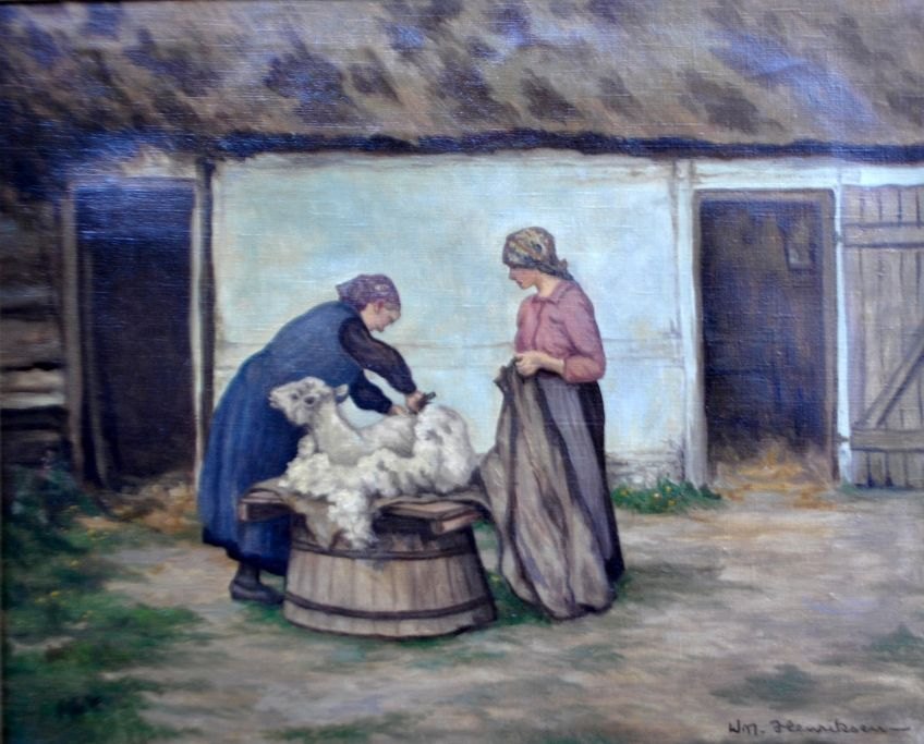 Henriksen, William M. (1880-1964) Danmark: Fåret klippes. Vejby Mark. Olie på lærred. Signeret. 48 x 59 cm.