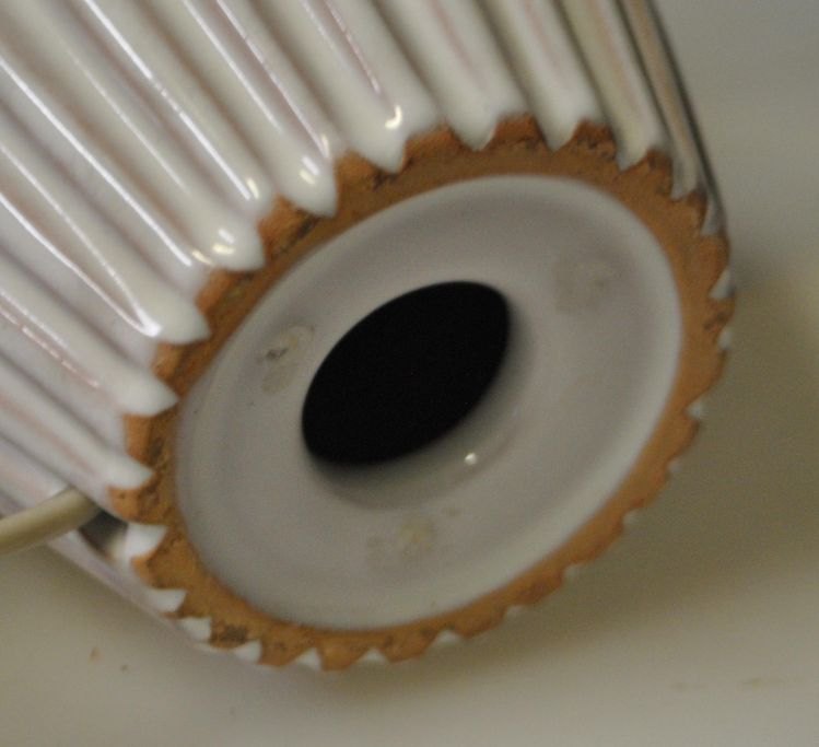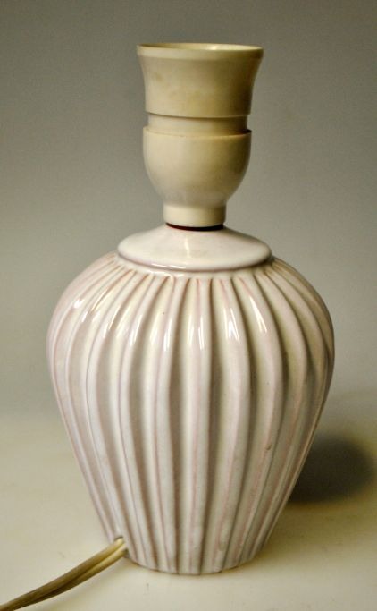 Dansk keramiker (20. årh): Bordlampe. Hvidglaseret rødler. Med riller. I siden hul til ledning. Ustemplet. H: 12 cm. Højde med fatning: 18 cm.
