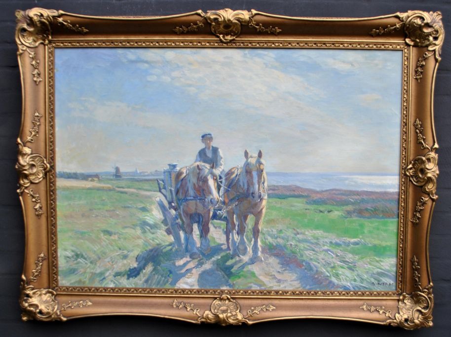 Nyrop, Børge (1881 - 1948) Danmark: En hestevogn ved Ringkøbing Fjord. Olie på lærred. Signeret. 70 x 100 cm.