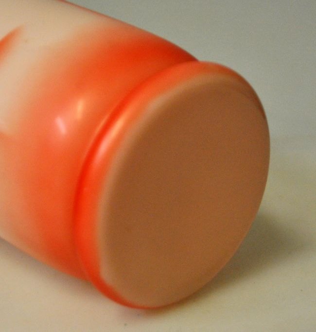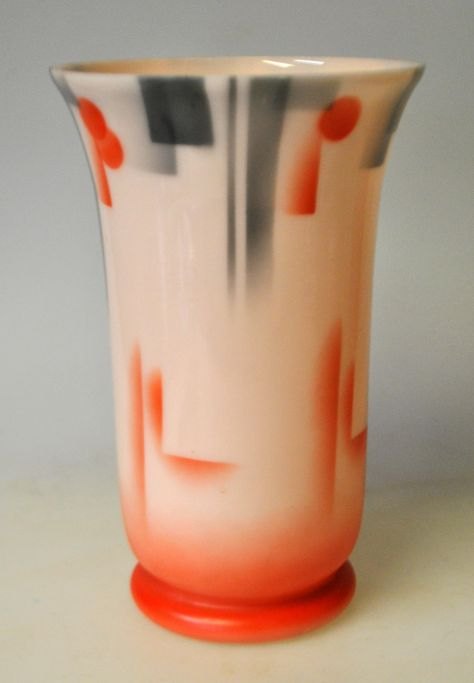 Art deco vase, 1920 - 30. Danmark. Lysrødt glas med bemalinger i geometriske mønstre. H.: 16 cm.