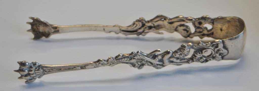 Sukkertang i sølv, Augsborg, 19. årh. Tyskland. Rococo stil. Dekoreret med putto og løvefødder. L.: 14 cm.