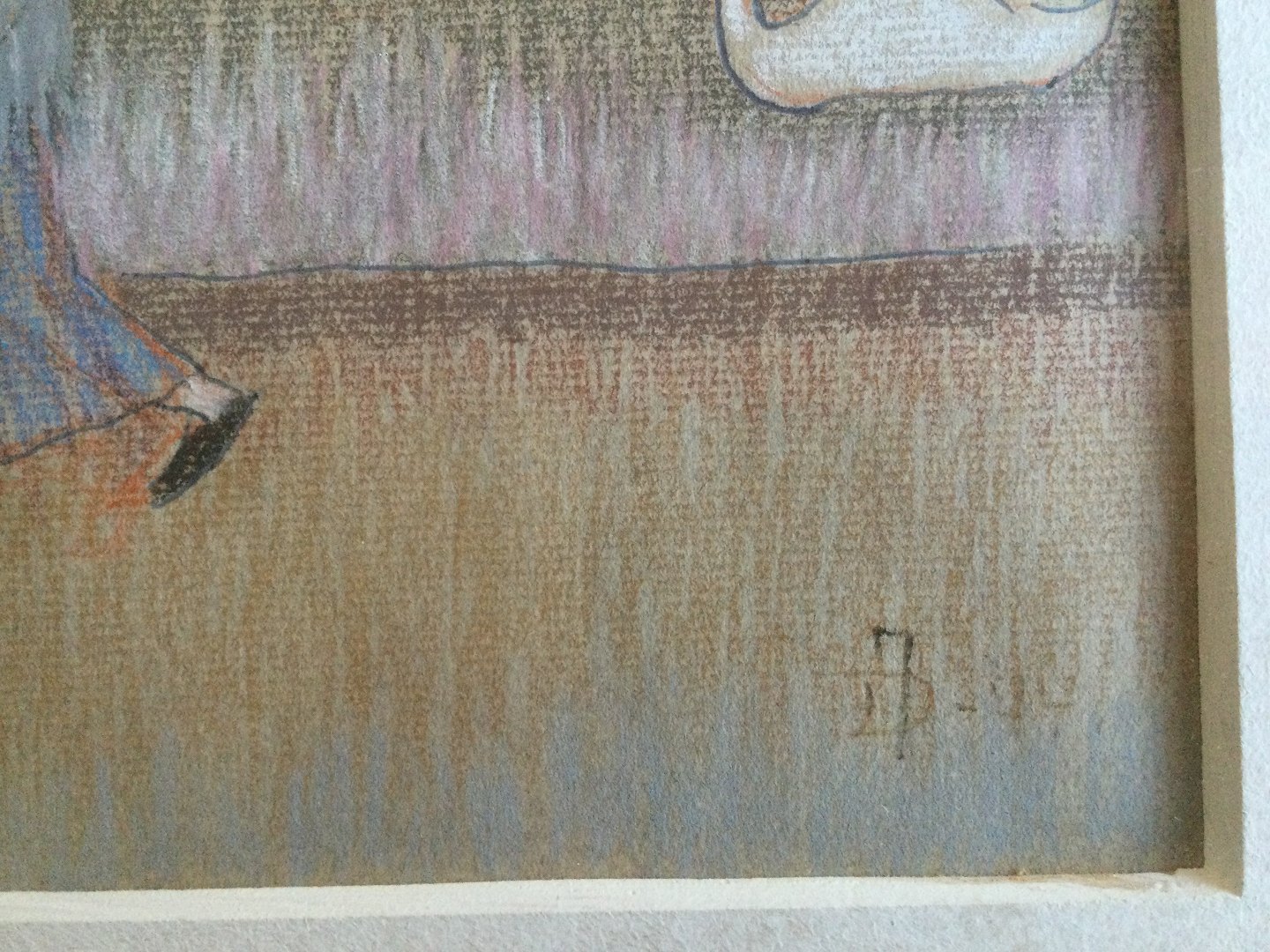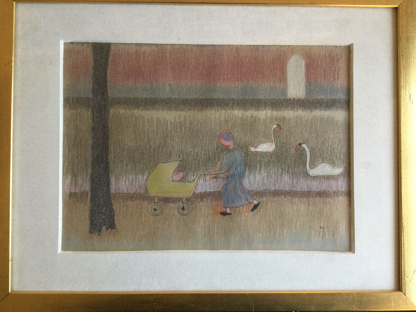 Oliekridt tegning af Johannes Dührkop 1974 - Pige med barnevogn.