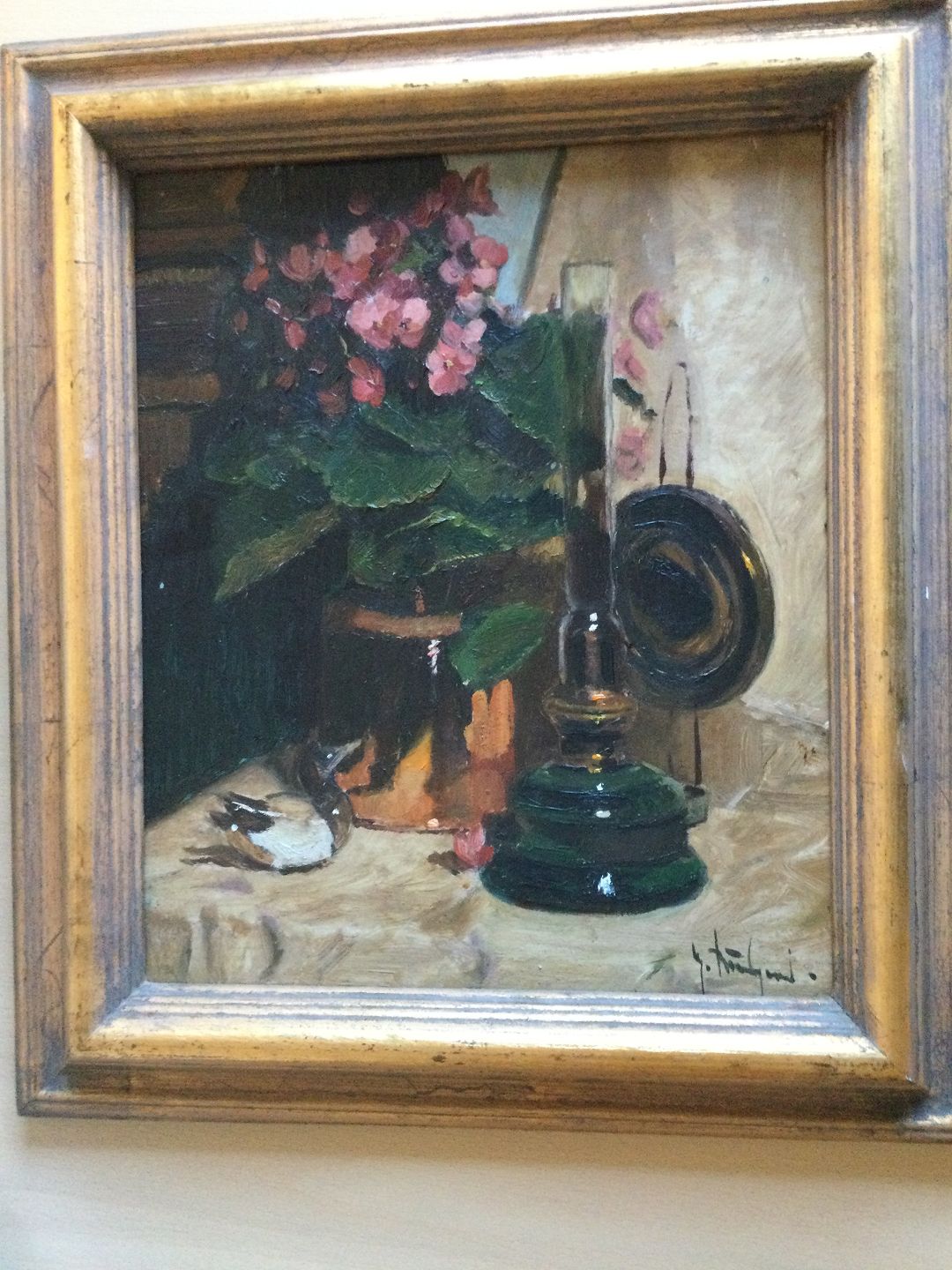 Opstilling på bord med petroleumslampe, fugl og blomst.