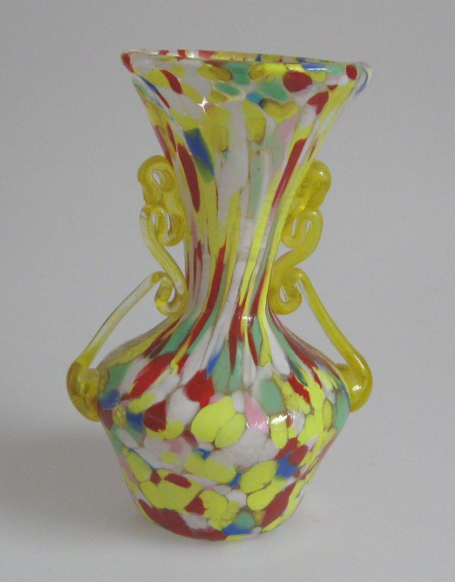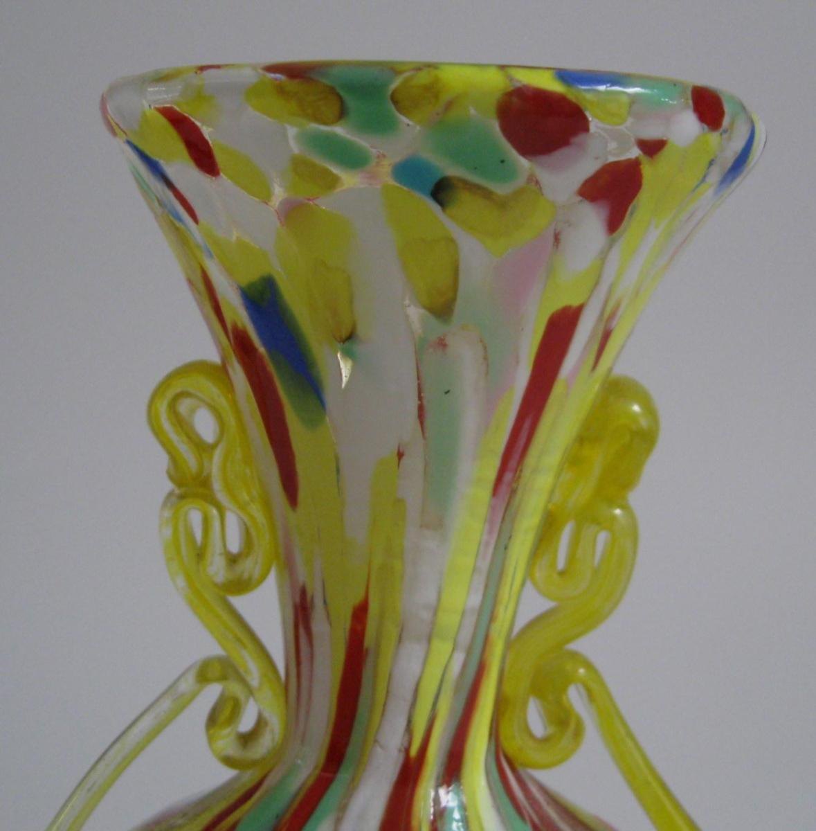Italian vase, in multicolored glass, with handles in yellow glass. 20th century Venice. H .: 15 cm.