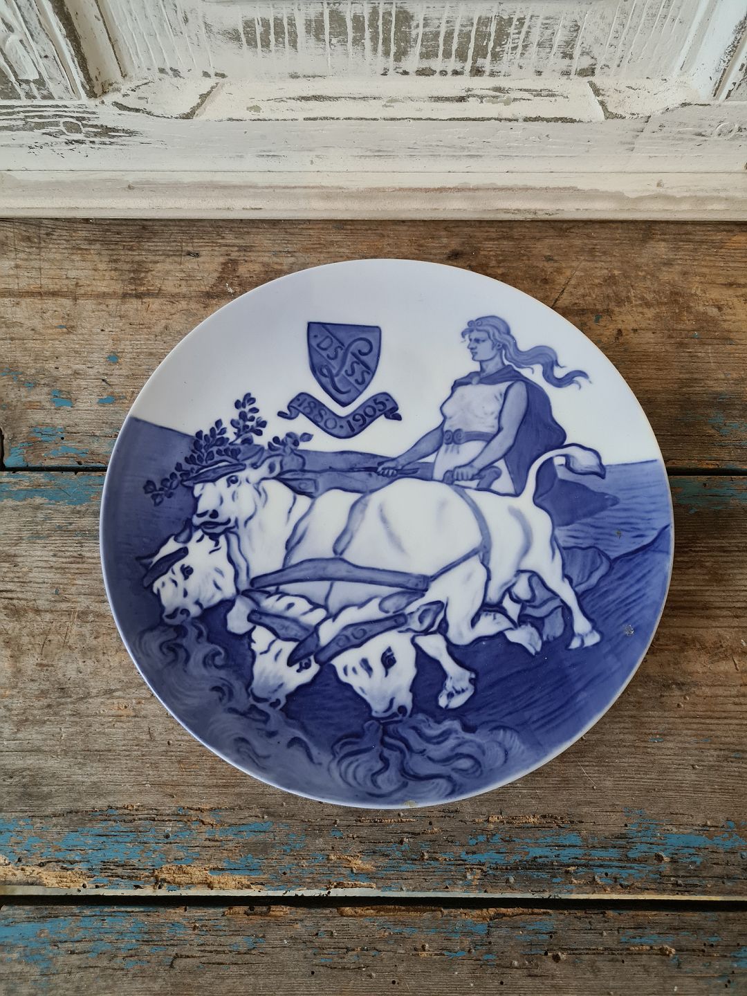 Royal Copenhagen Mindeplatte fra 1905, Landbrugsudstilling i København - Gefion pløjer med tyre.