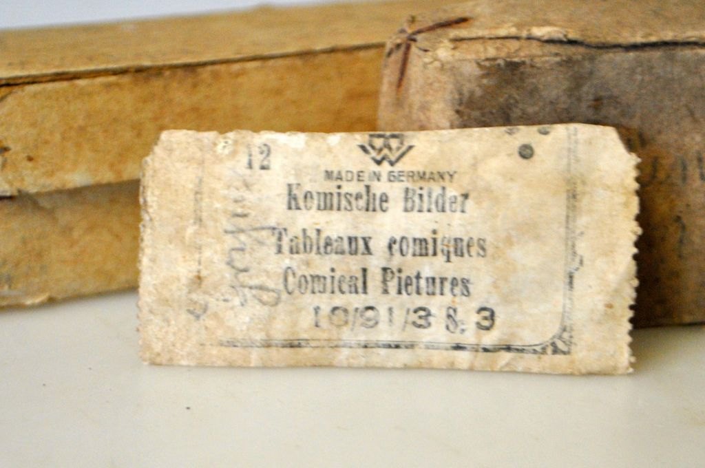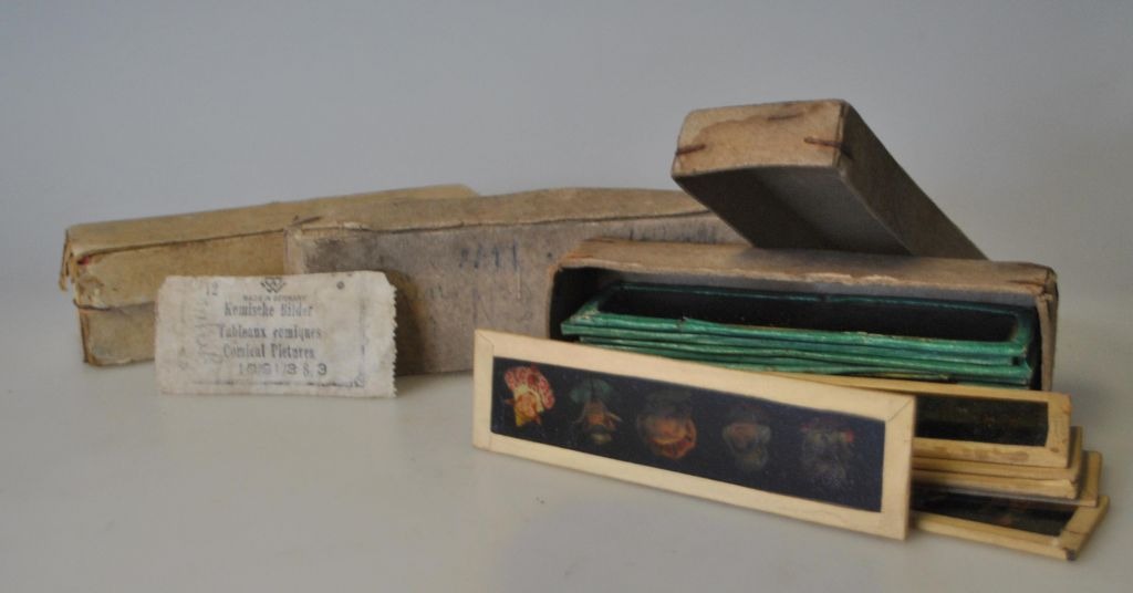 3 æsker med lysbilleder på glas til fremvisning, 19. årh. Tyskland. I farver. "Komiske billeder". 11 x 3 cm. I alt 49 lysbilleder. I originale æsker med label.