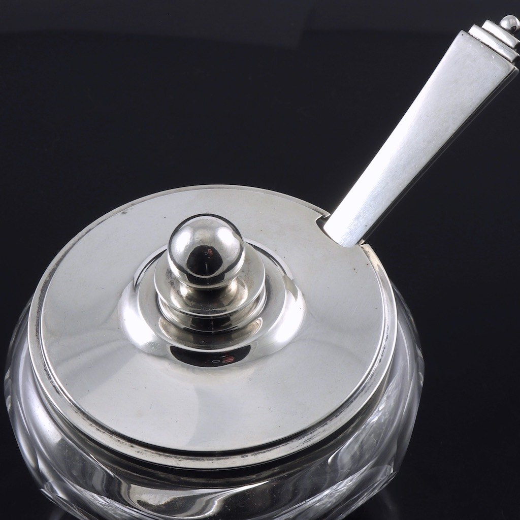 Georg Jensen. Marmeladekrukke med låg og ske i sterlingsølv - Pyramide #600A