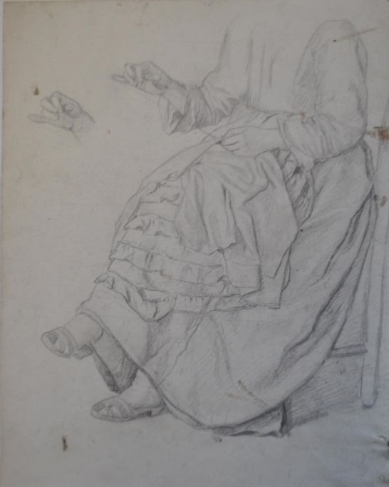 Tornøe, Wentzel (1844 - 1907) Danmark: Skitse - en italiensk kvinde syr. Bly på papir. Verso stemplet. 30 x 24 cm.