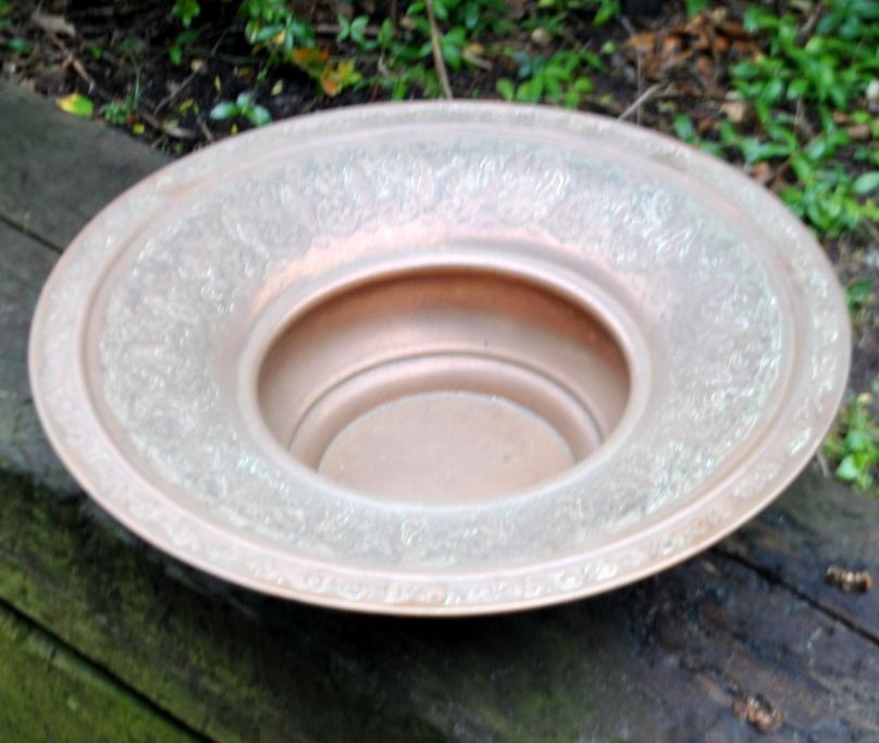 Large antique baptismal font in copper, 19th century Denmark. With numerous hammered decorations in the form of foliage. H .: 12 cm. Dia .: 40 cm.