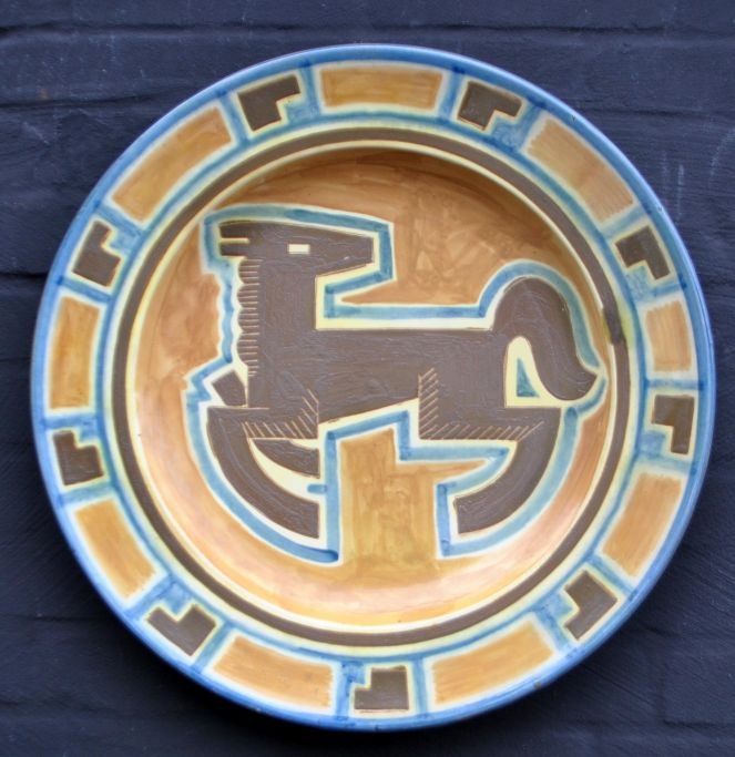 Unique dish, art deco, design: Ejner Johansen, 1938, Denmark. Clay with glazes in light blue, brown and yellow. Signed. Dia .: 51 cm.