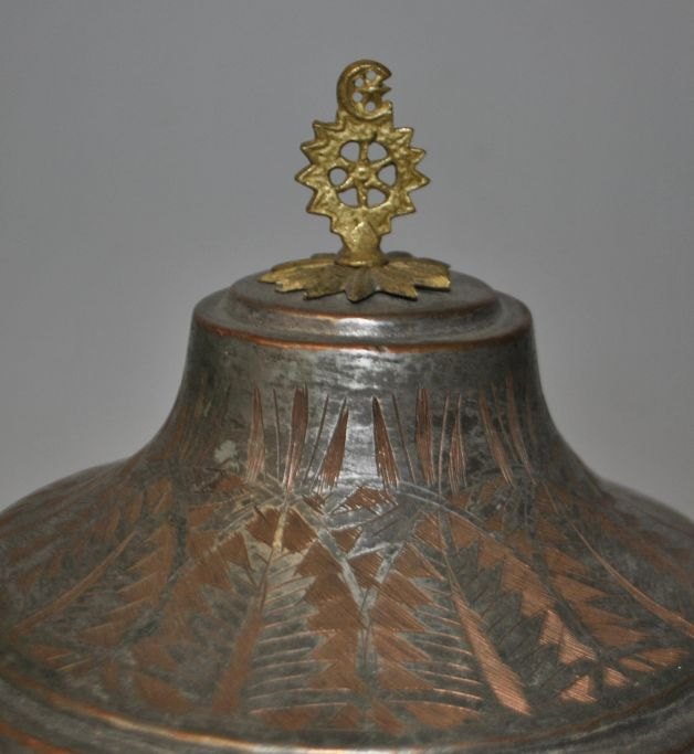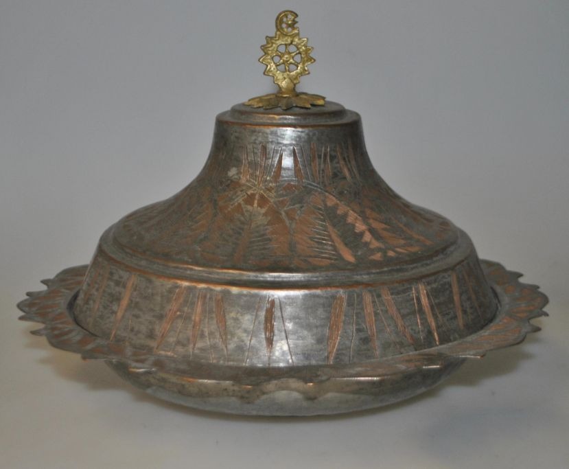 Tyrkisk lågfad i kobber, 19. årh. Kobber belagt med tin. Dekoreret med talrige stregdekorationer og bladværk. Øverst på låg en topdekoration med stjern og havmåne i messing. H.: 18 cm. Dia.: 24 cm.