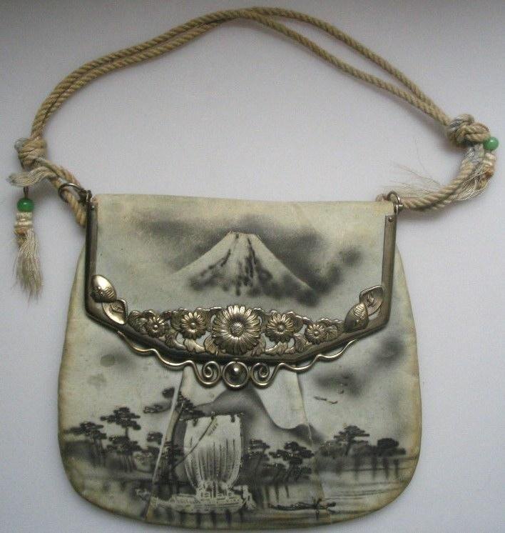 Japansk dametaske, ca.1900. Af bemalet lyst læder med bl.a. motiv fra Futijama. Med lukke dekoreret med lotus blomster og fugle. Strop med perler. H.: 17 cm. B.: 18 cm.u. uden hank. Indvendig beklædt med silke.