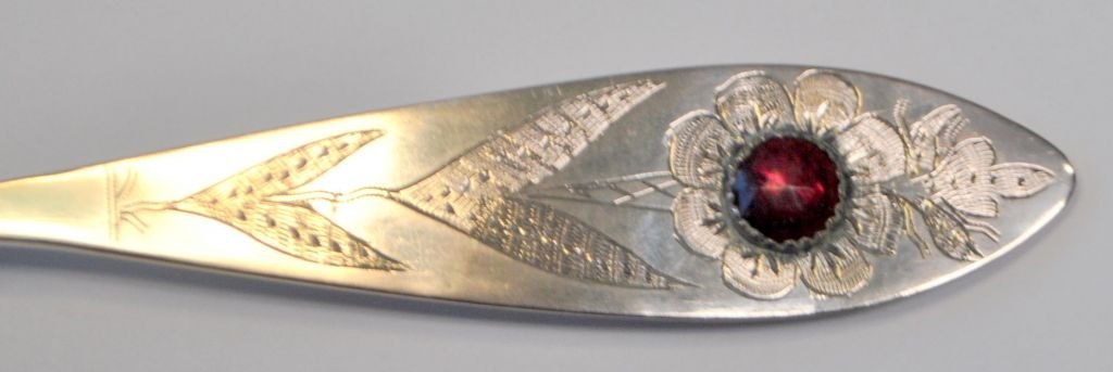 Sølvske med en glasflus 1839, stemplet Meyenborg, Slesvig- Holsten, Tyskland. Med de skønneste indgraverede blomsterdekorationer. Stemplet. Længde.: 25 cm. Vægt:: 55 gram. Med indgravering: P. H. Knoll u Fr. Moargrd.1839.