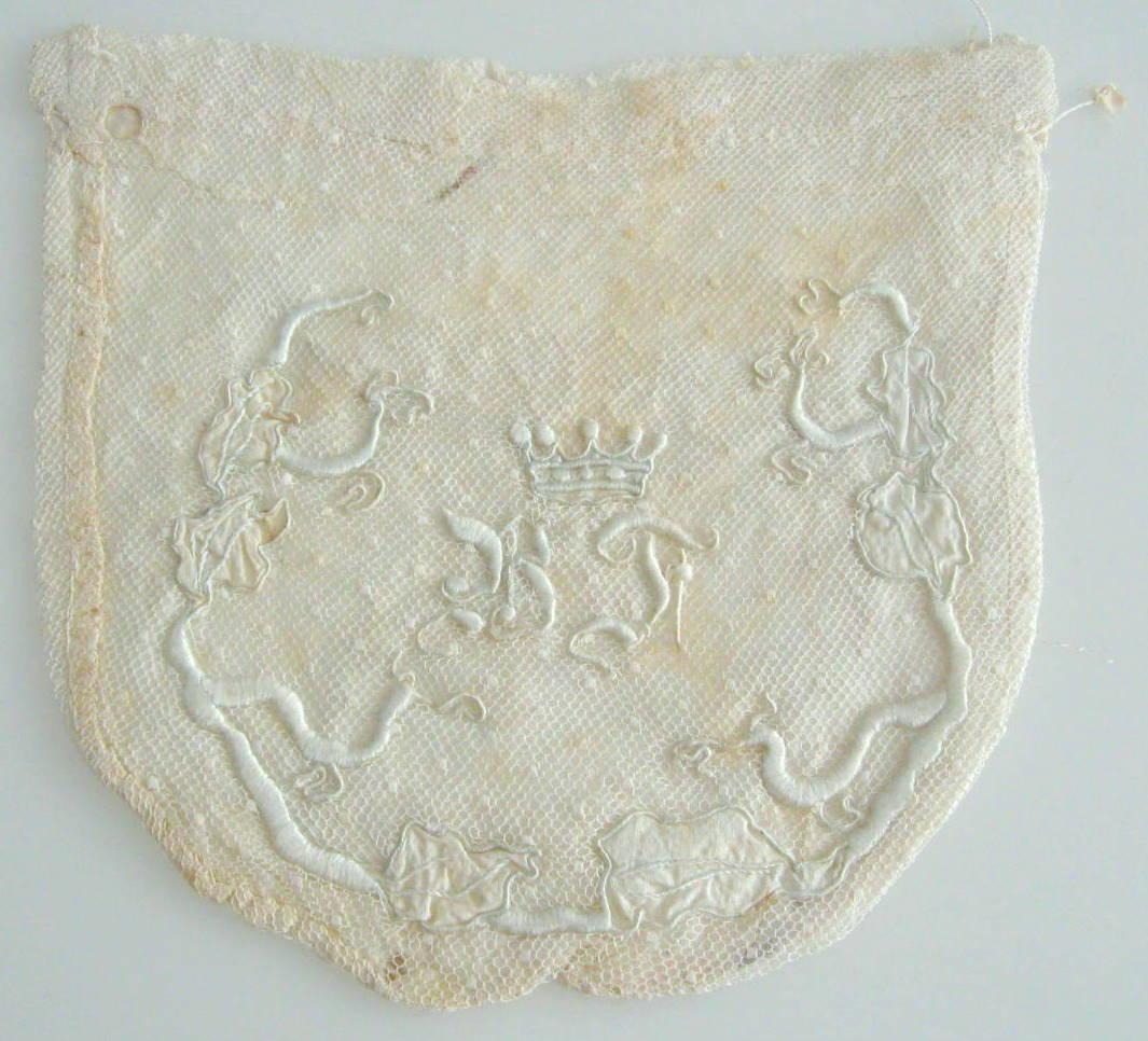 Kniplet taske, 19. årh. Med initialerne: BF og krone for Gyldencrone. H.: 19 cm. B.: 20 cm. Initialerne BF står for: Basse Føns. Hindsgavl.