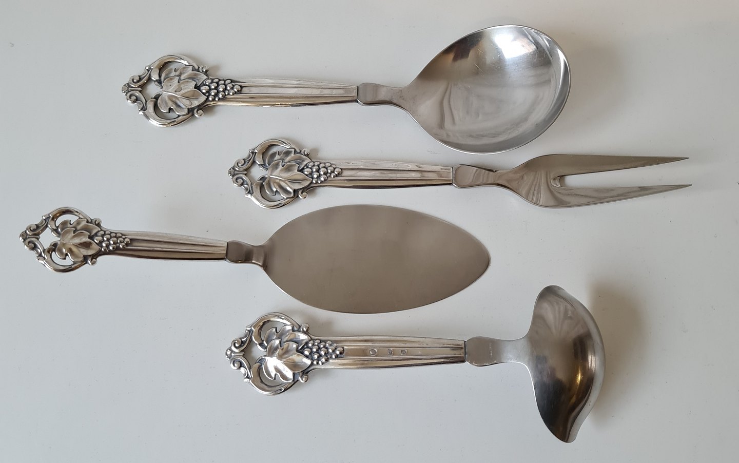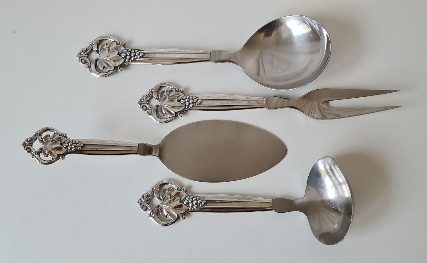 4 stk serverings dele i sølv og stål, skaftet er smukt dekoreret med drueklase