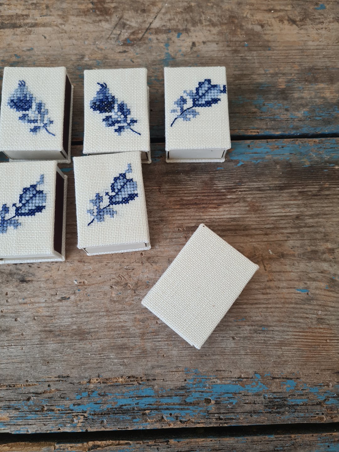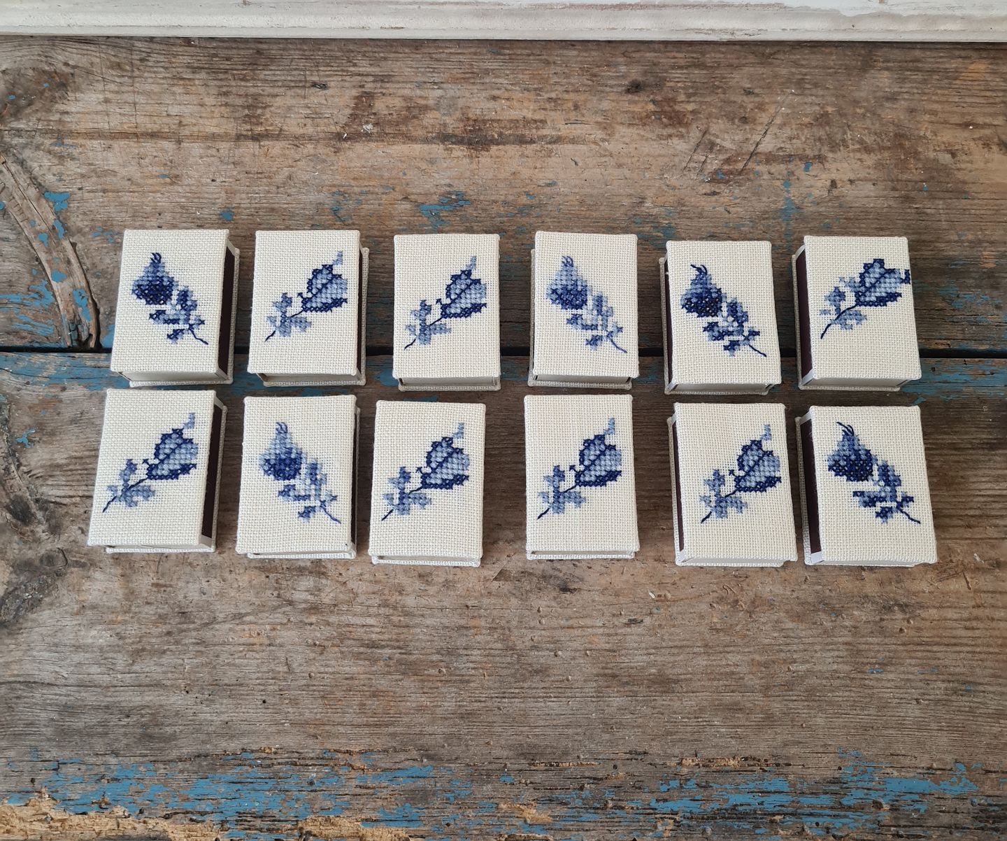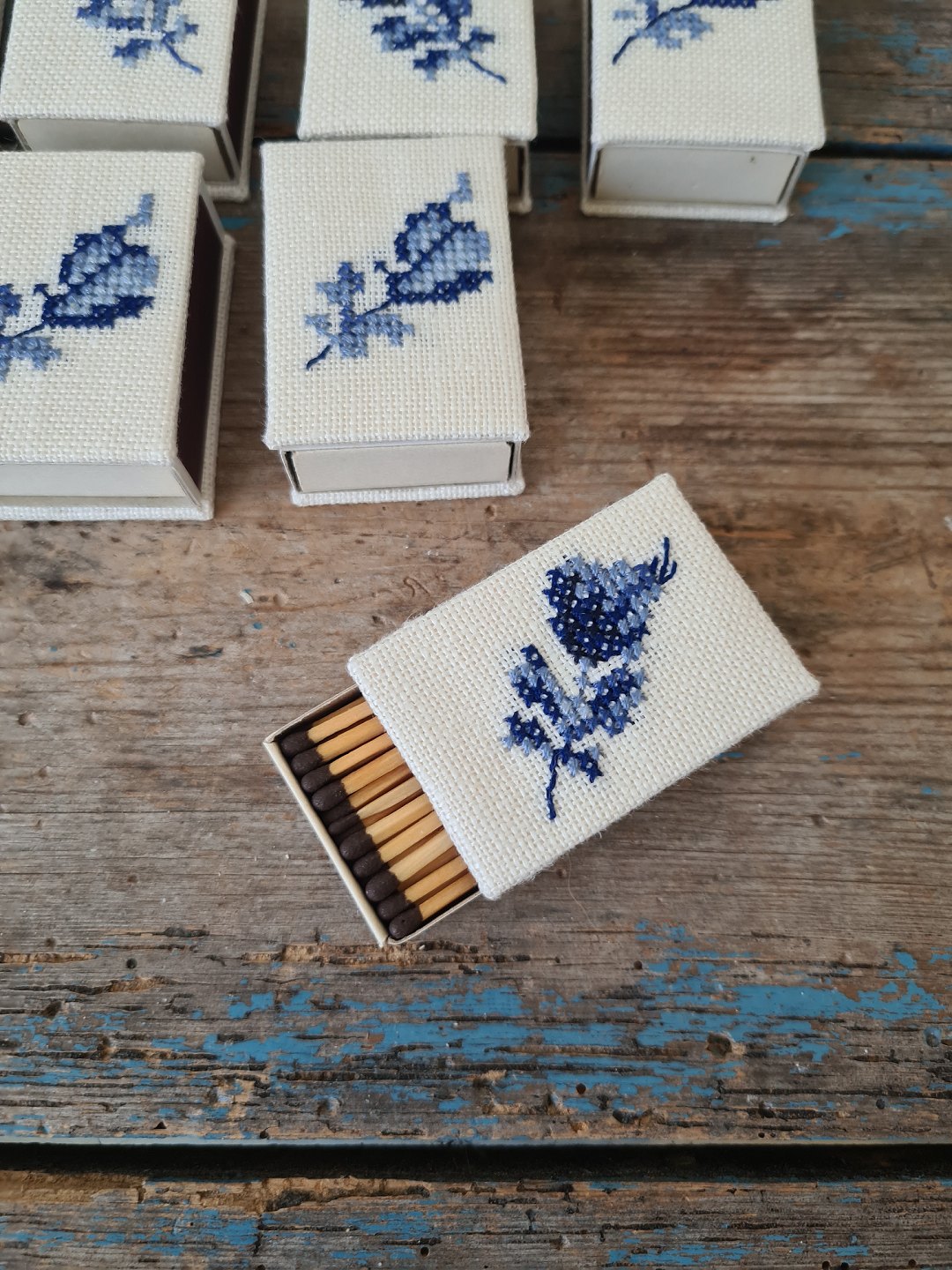 Sæt på 12 stk tændstiks æsker med broderet med motiv inspireret af Blå Blomst
