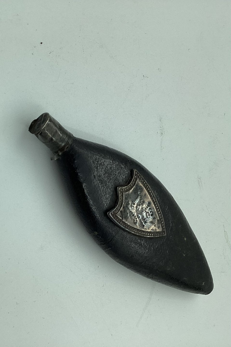 Bladformet læderbetrukket parfume flacon 1803. Skjolde af sølv på hver side. Ejerinitialer samt årstallet 1803. I god stand. Længde 11 cm (4.33 inch)