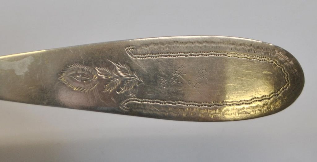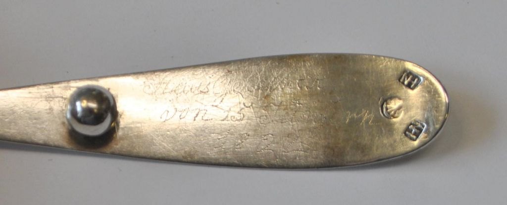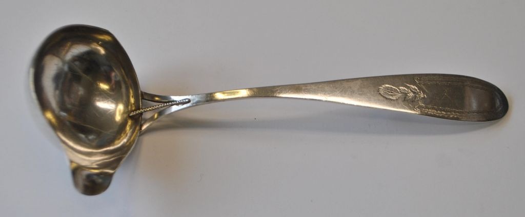 Empire sovse ske af sølv, 1824, Danmark. Mester Nicolay Hansen (1775 - 1835) Tønder. Stemplet. Verso indgravering: Hans Gechenck 1824. L.: 18 cm.