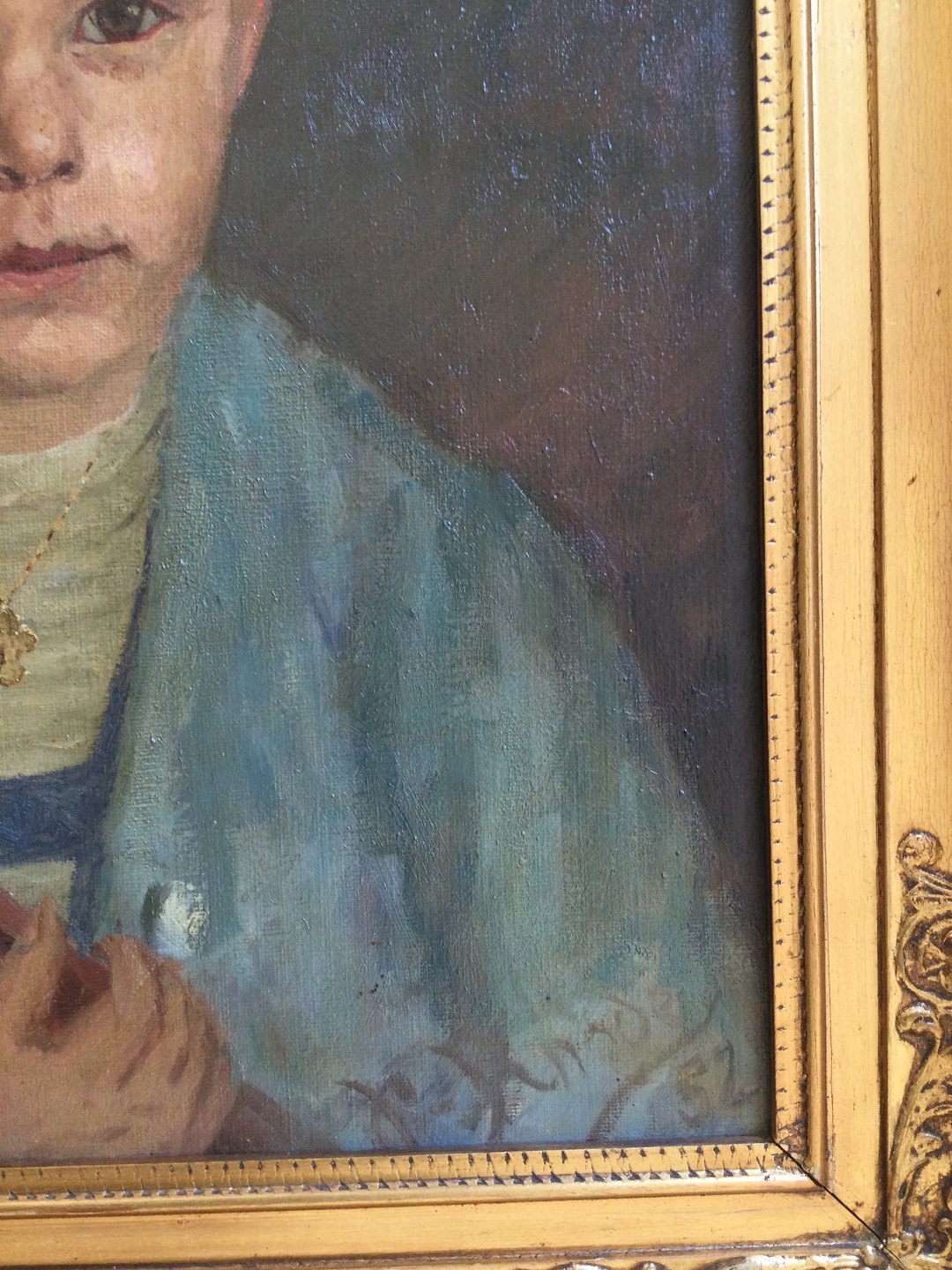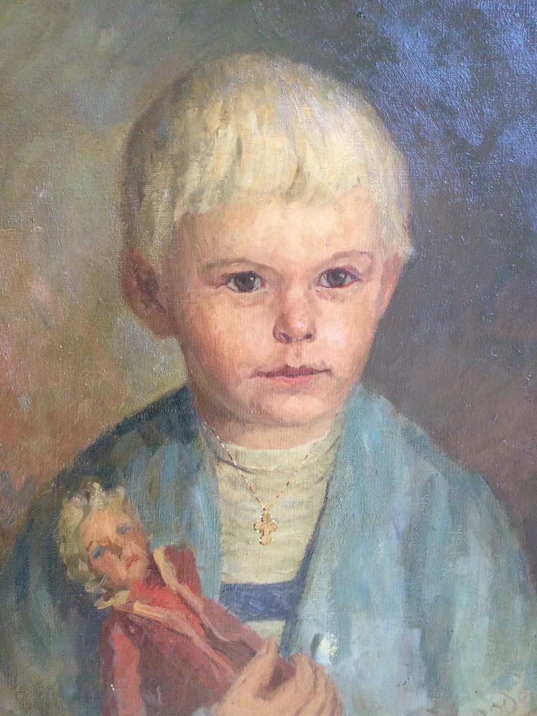 Maleri af Christian Rhode - Portræt af lille pige med Dagmarkors og dukke 1952.